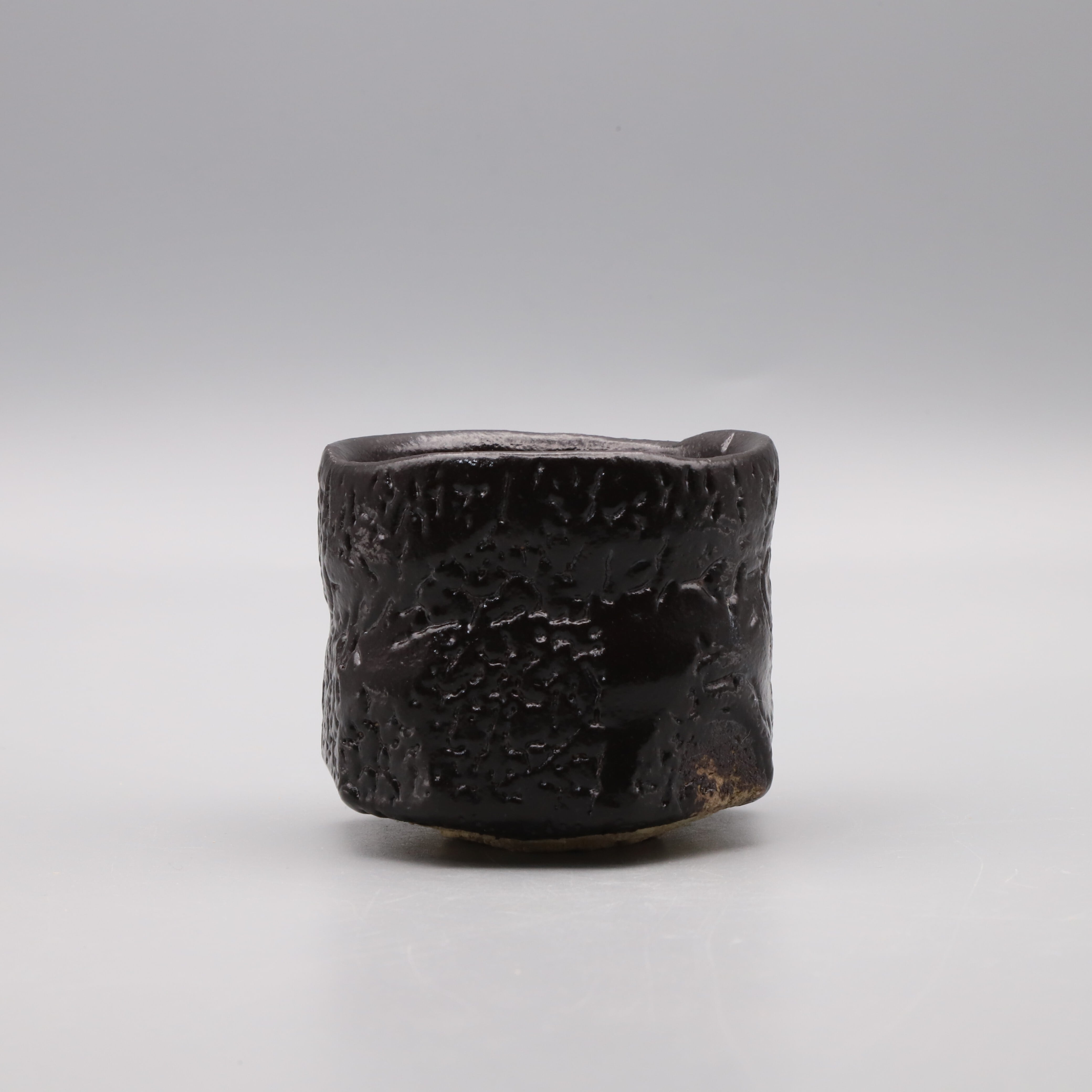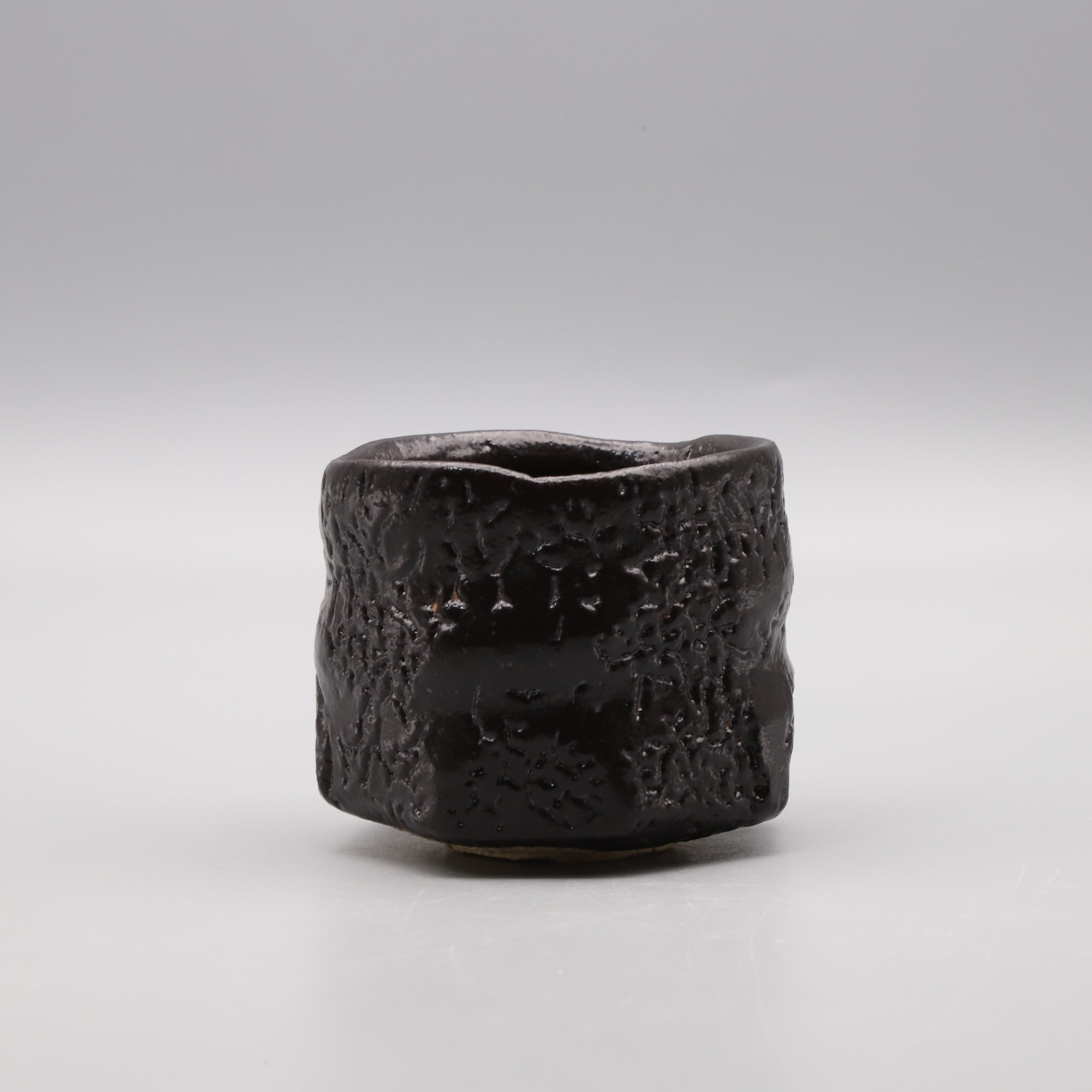 Setoguro sake cup fired in an hole kiln ("anagama"), made by Osamu Taniguchi. This guinomi (sake cup) recreates the cylindrical shape often seen in Setoguro tea bowls. Carefully shaped with a spatula, the piece features a stunning jet-black kairagi (toad-skin-like glaze). It is a masterpiece crafted with utmost dedication and without a hint of compromise.