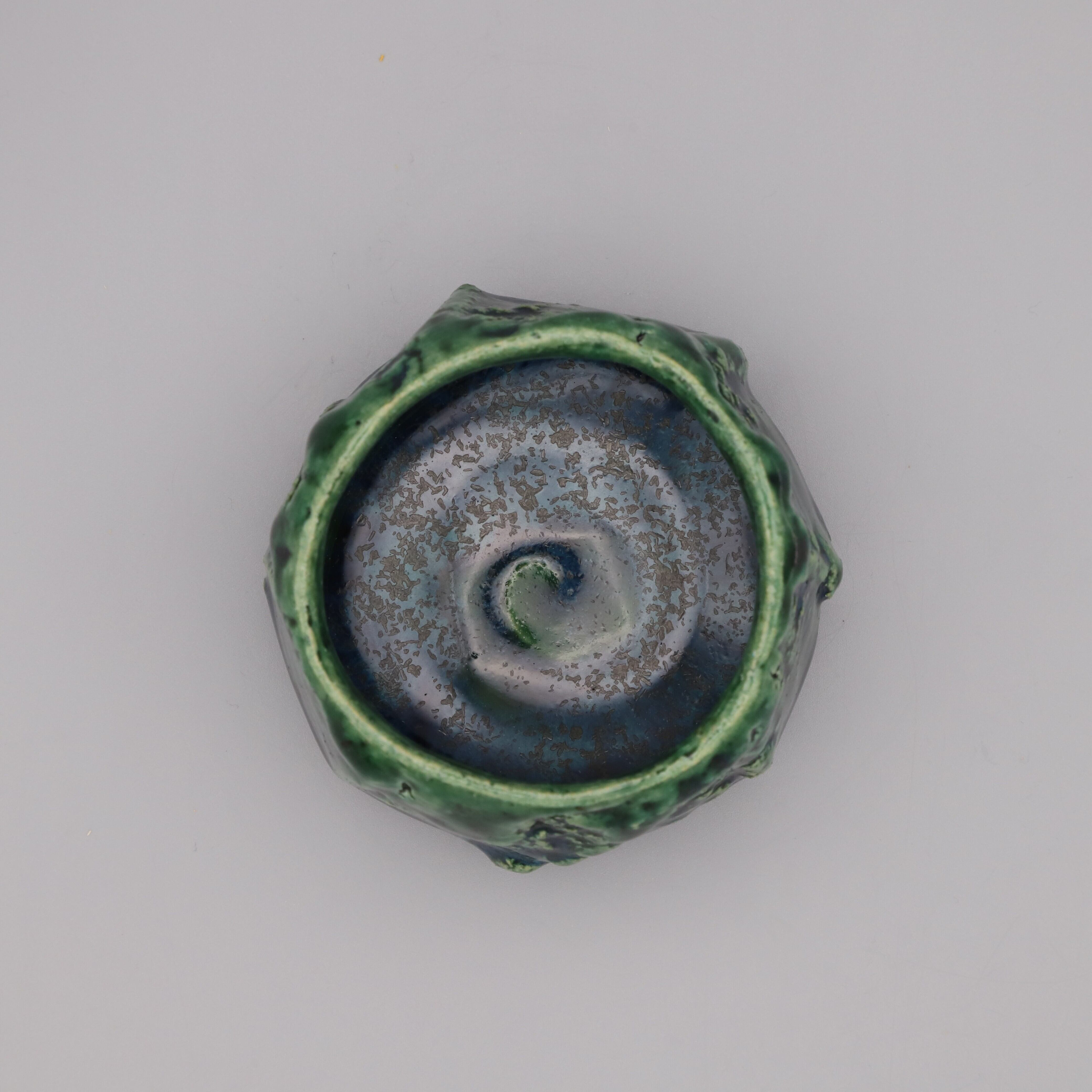 Oribe sake cup made by Osamu Taniguchi. It has a glossy dark green color, a slightly rough texture, and is meticulously shaped using a spatula. Taniguchi is strongly associated with Shino, he has recently been focusing on Oribe ware as well. This is an exceptional piece created with unwavering dedication and without any compromise.