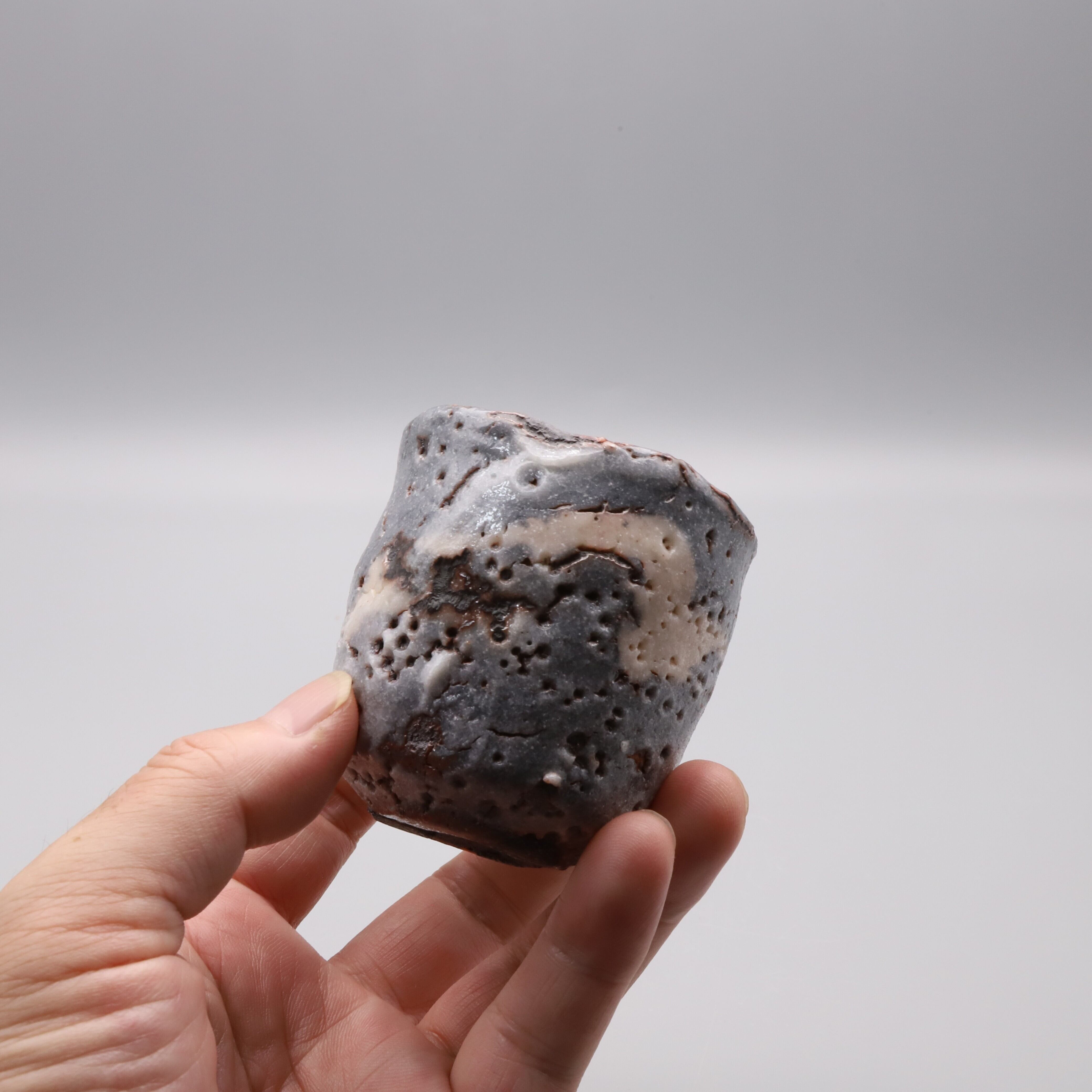 關 共歩作陶、鼠志野ぐい吞です。鼠色の柚子模様に白い地肌が覗き見する様が見事な作品です。關作品には珍しく小振りに作られキュートな感じです。本作品は2025年6月に窯から出されたばかりの新作です。