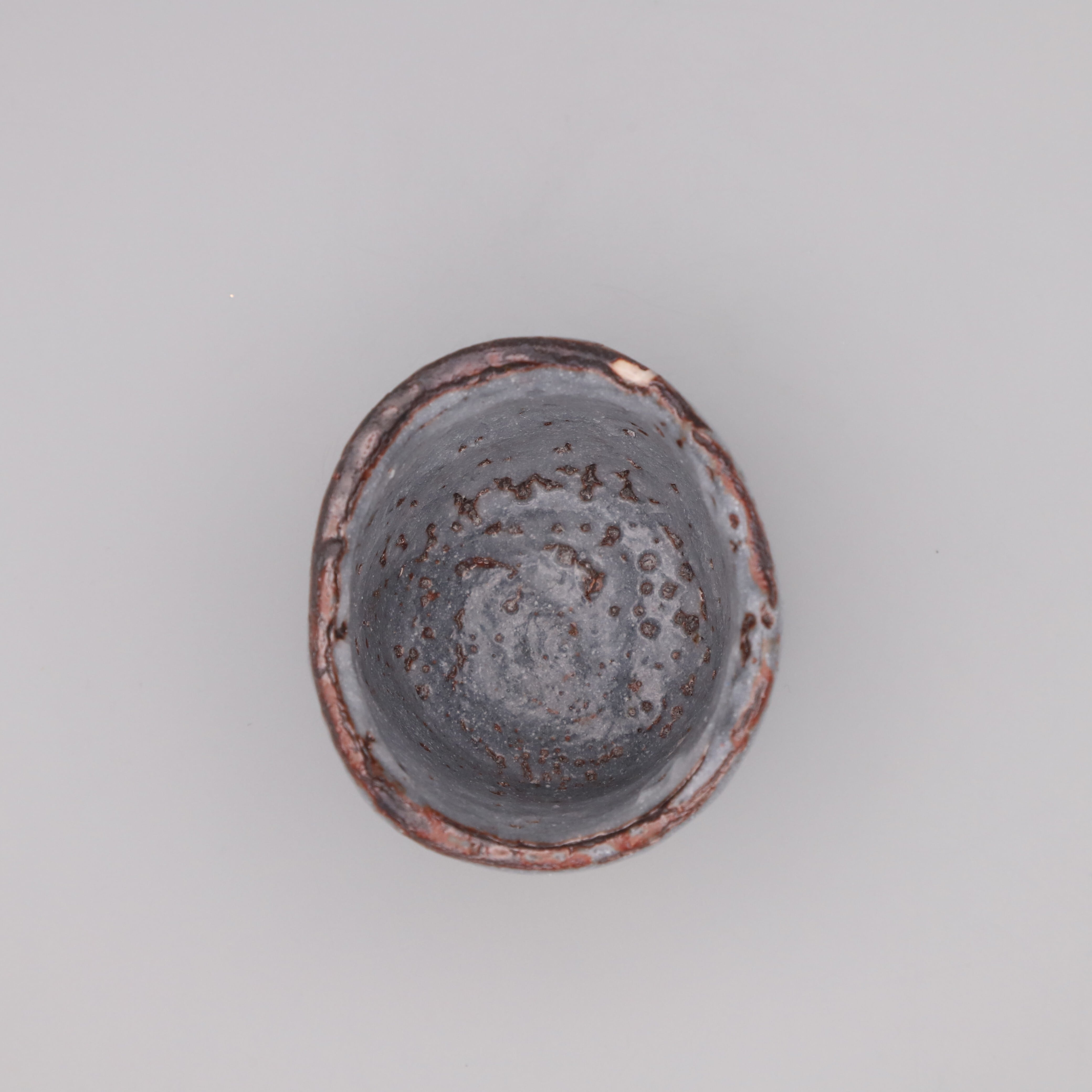 關 共歩作陶、鼠志野ぐい吞です。關作品の特徴のいびつな形と、鼠色の柚子模様に白い地肌が覗き見する様が見事な作品です。關作品には珍しく小振りに作られています。本作品は2025年6月に作陶された新作です。