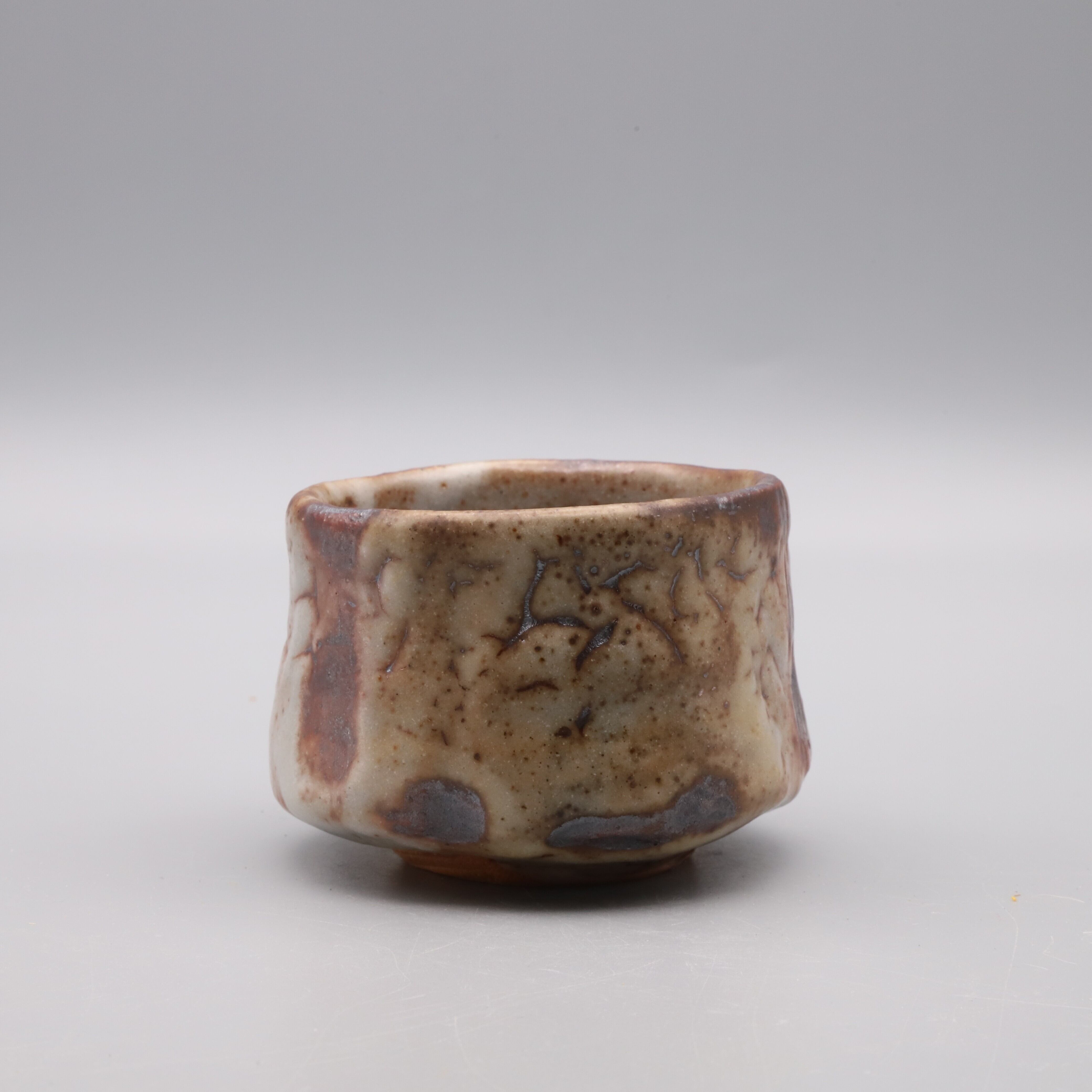 Nezumi-shino guinomi (sake cup) made by Morio Asahi. The interplay of flame-seared crimson and rugged white glazes creates a powerfully arresting presence in this work.