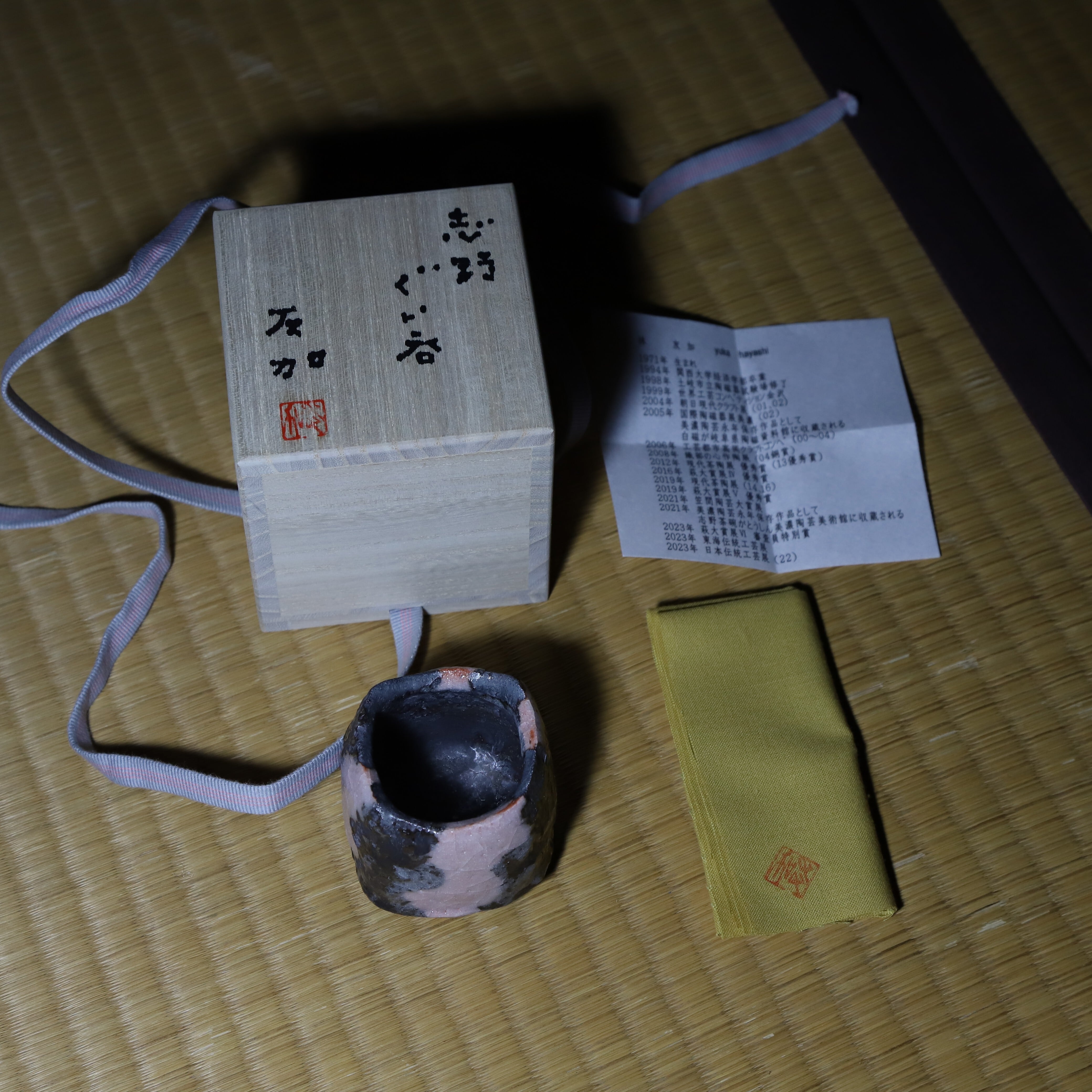 It is a sake cup that fit with the times by incorporating design into traditional Shino. Feminine writing on the box and pink box straps make you feel like Yuka.