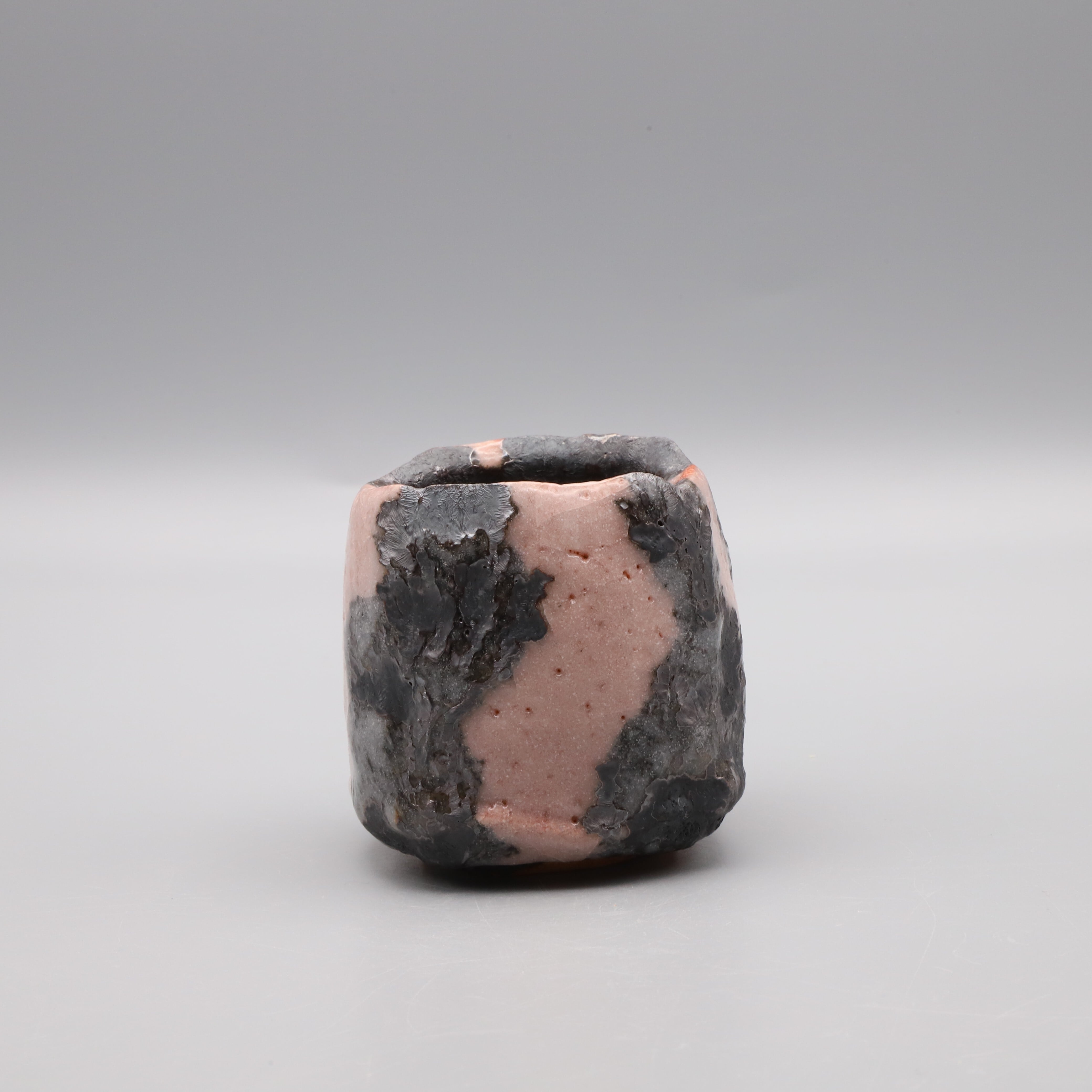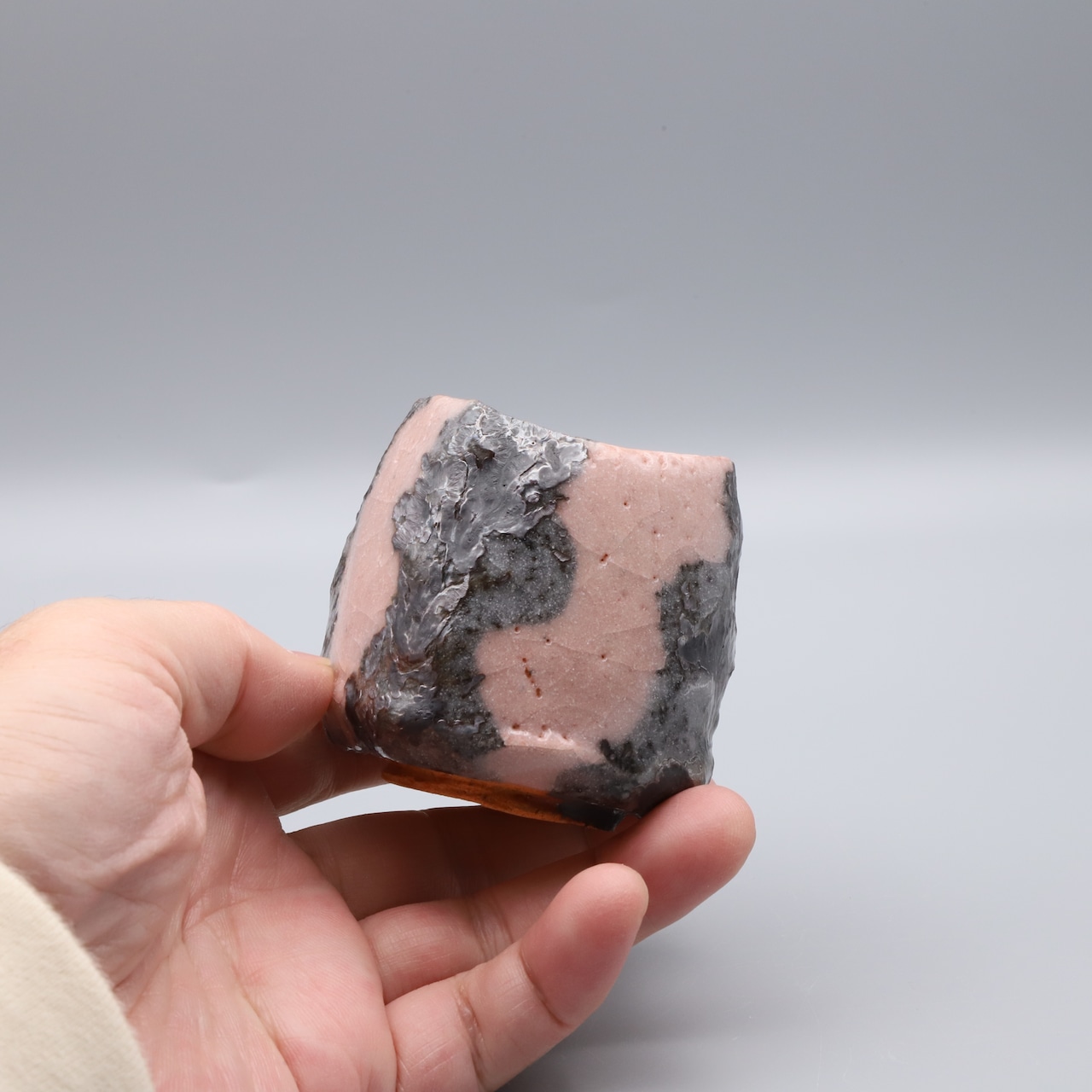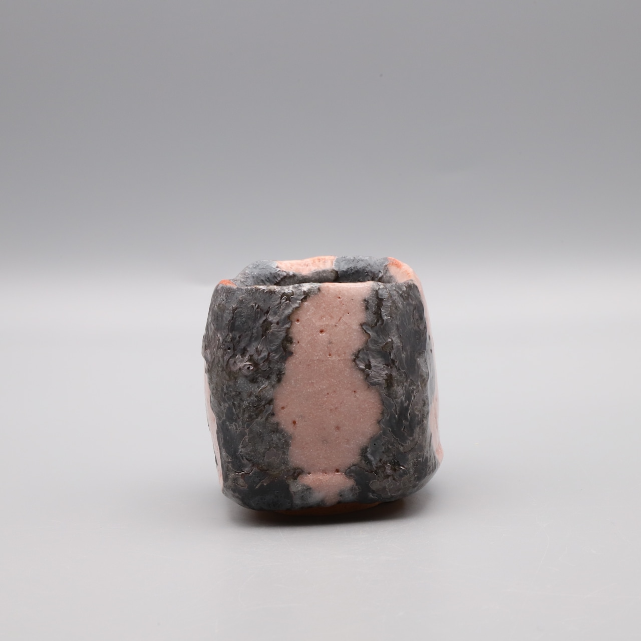林 友加 作陶、志野ぐい吞み ピンクグレー角型です。ピンクの地肌にグレーの釉薬を被せてこの景色が作られています。どこから見てもピンクのラインに迎えられます。本作品は2025年に作陶された新作になります。