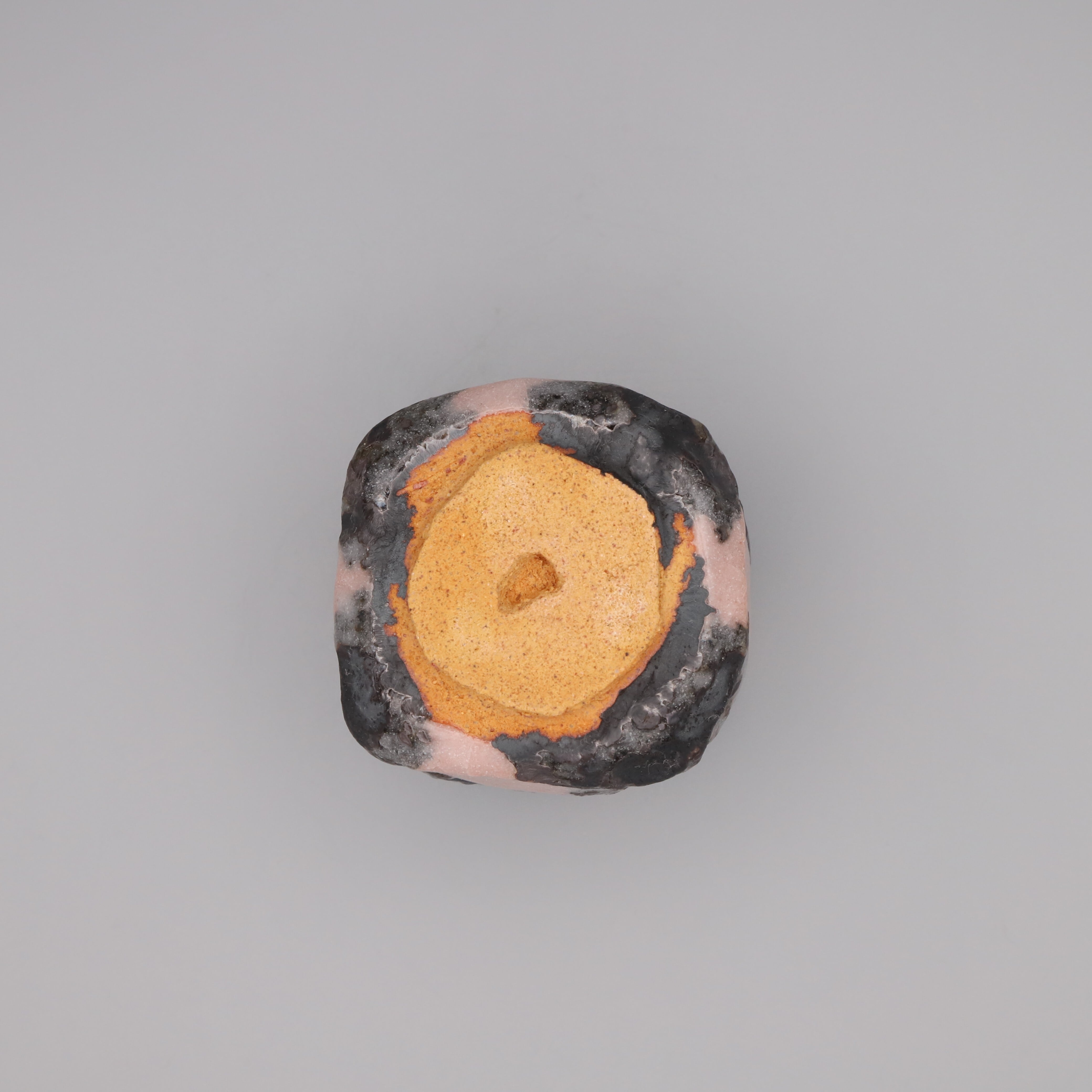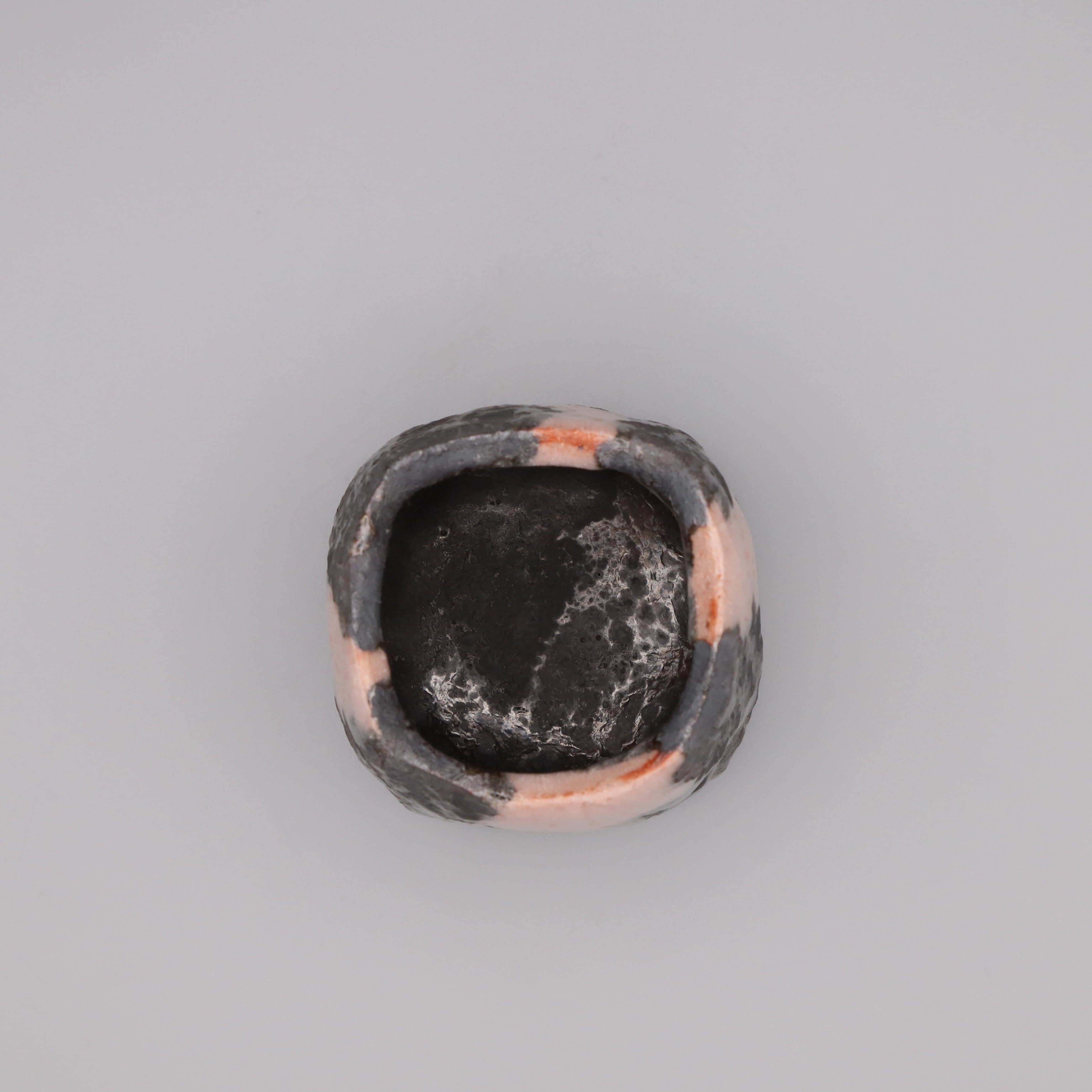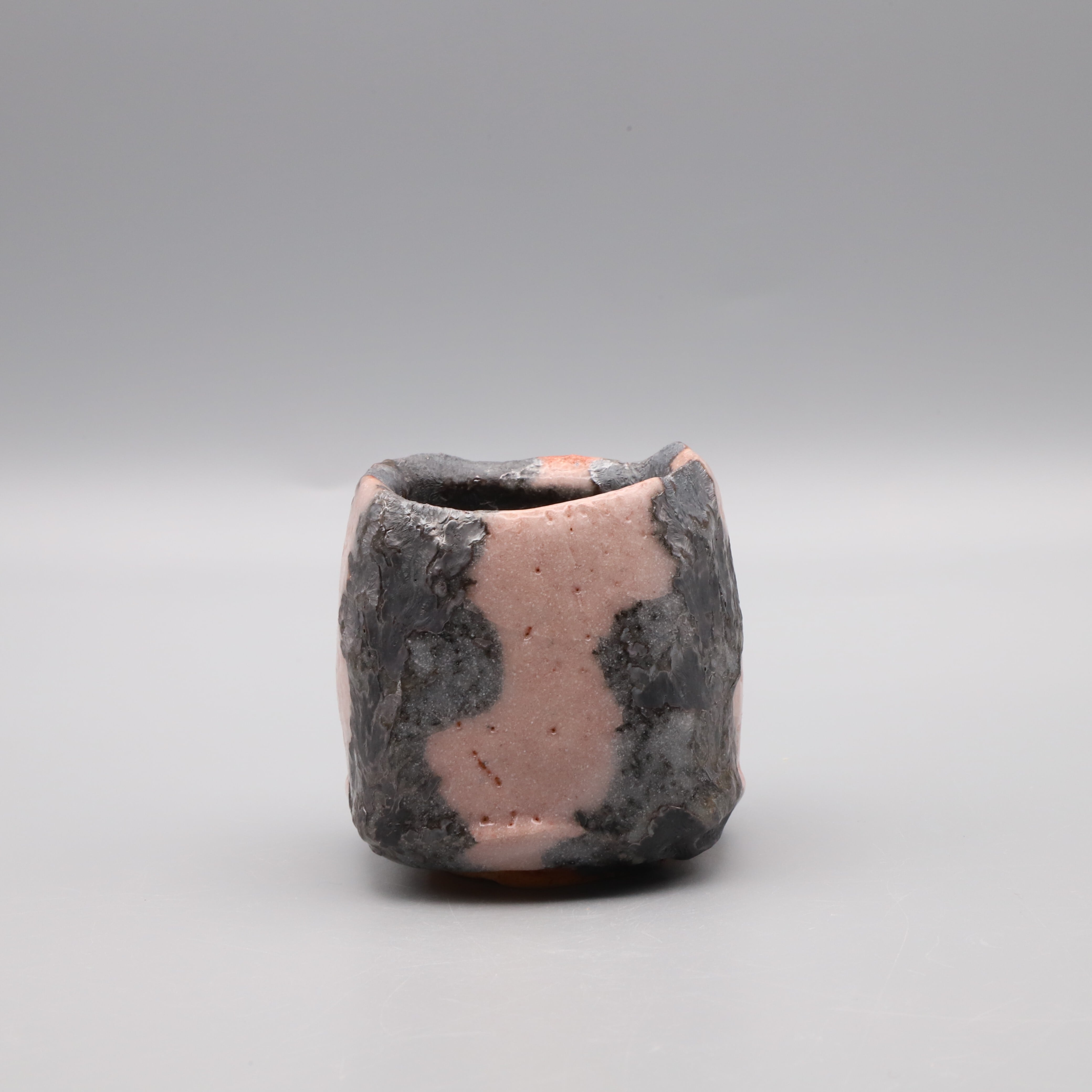 林 友加 作陶、志野ぐい吞み ピンクグレー角型です。ピンクの地肌にグレーの釉薬を被せてこの景色が作られています。どこから見てもピンクのラインに迎えられます。本作品は2025年に作陶された新作になります。