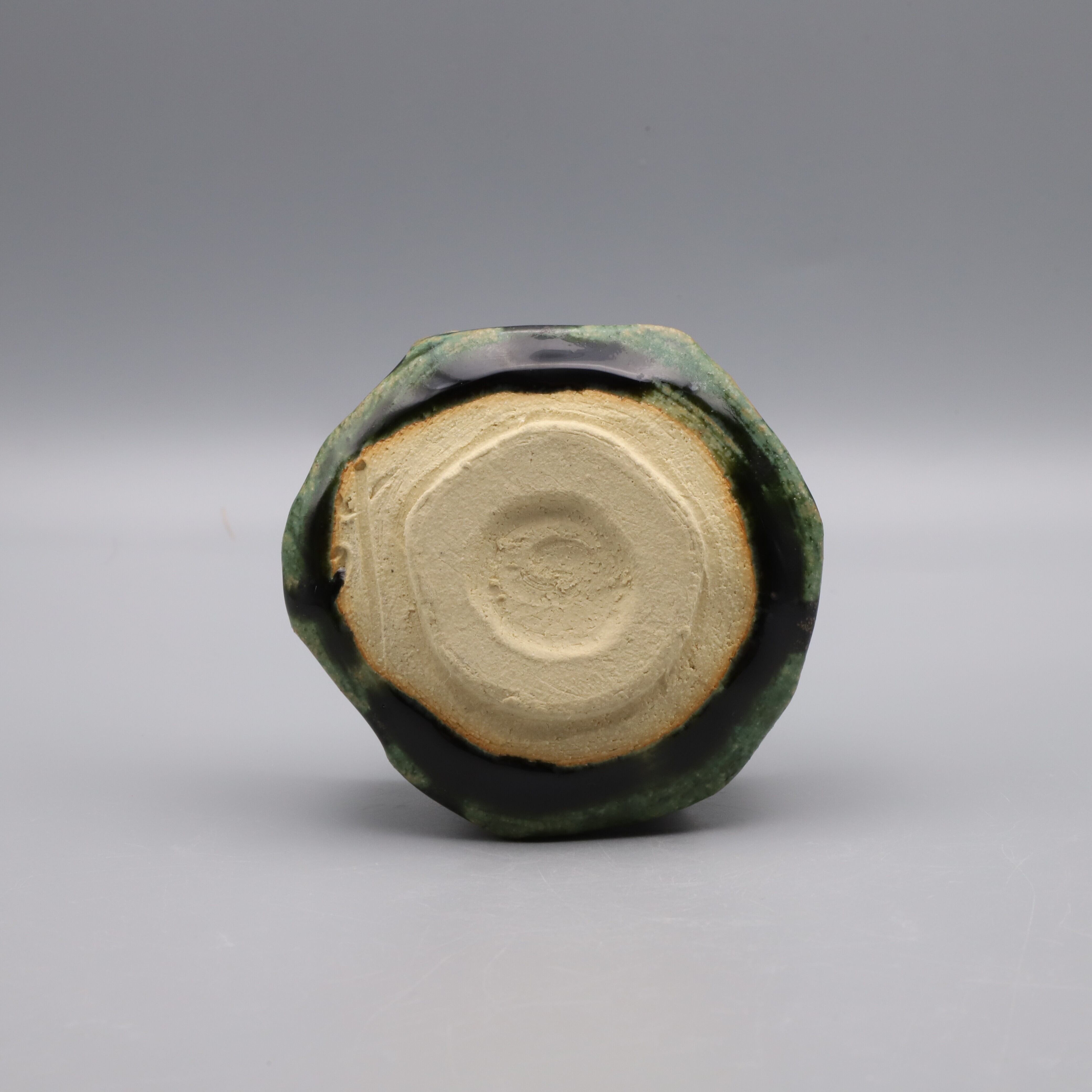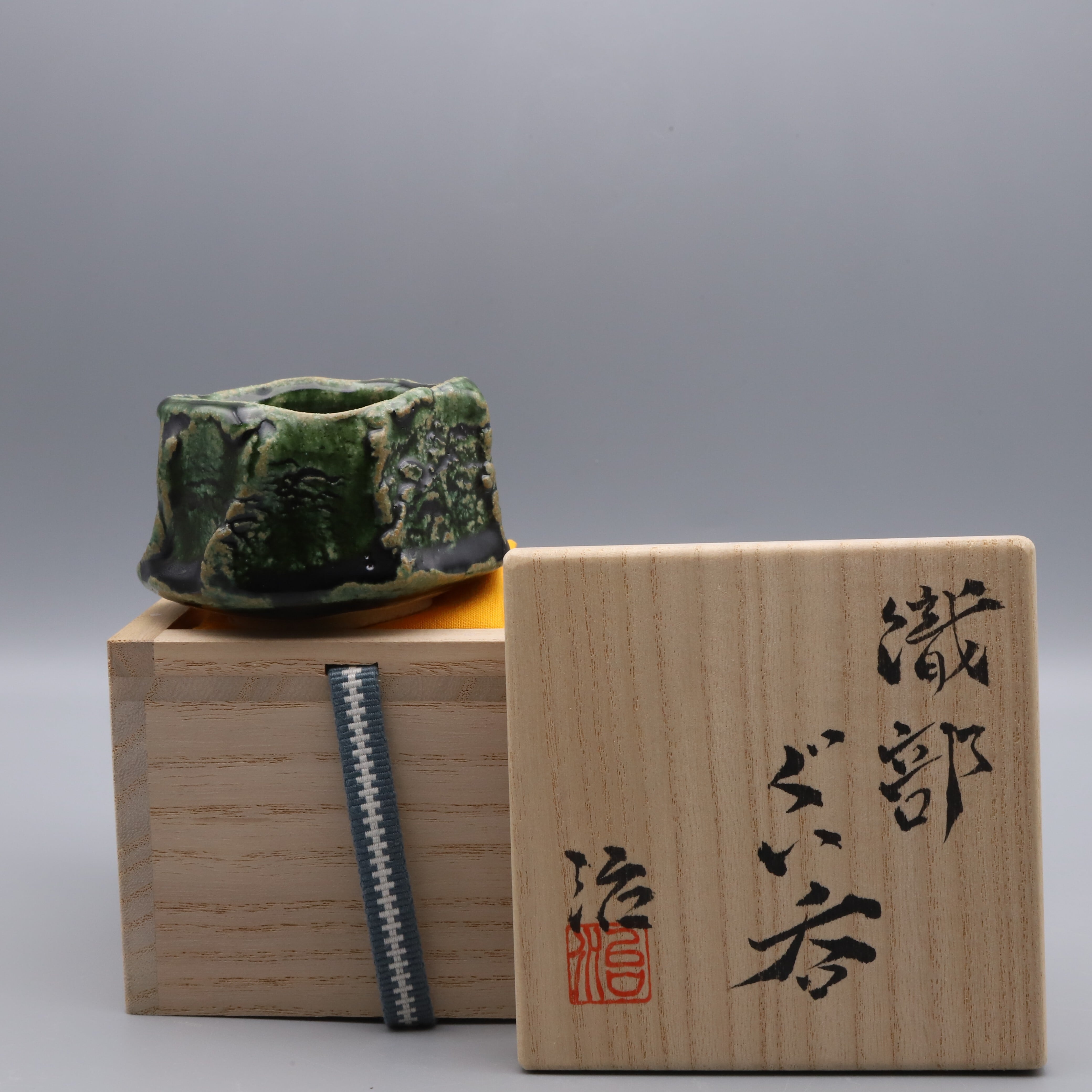 谷口 治作陶、織部 ぐい吞です。艶のある暗緑色を呈しており、ざらっとした手触りがあり、箆で削って成形しきっちり造形されています。谷口先生は志野というイメージが強いですが、最近は織部にも力を入れられています。一切の妥協も許していない渾身の逸品です。