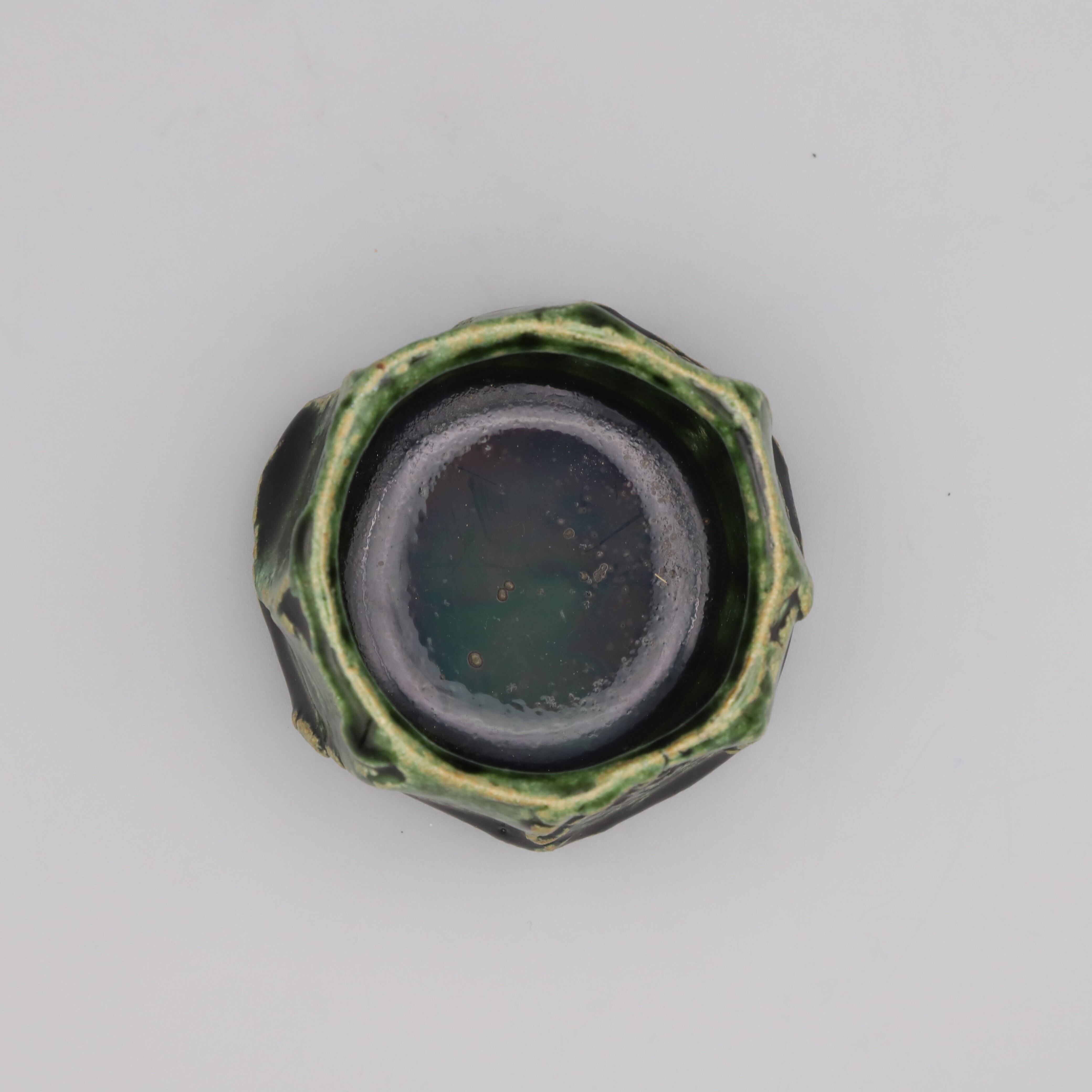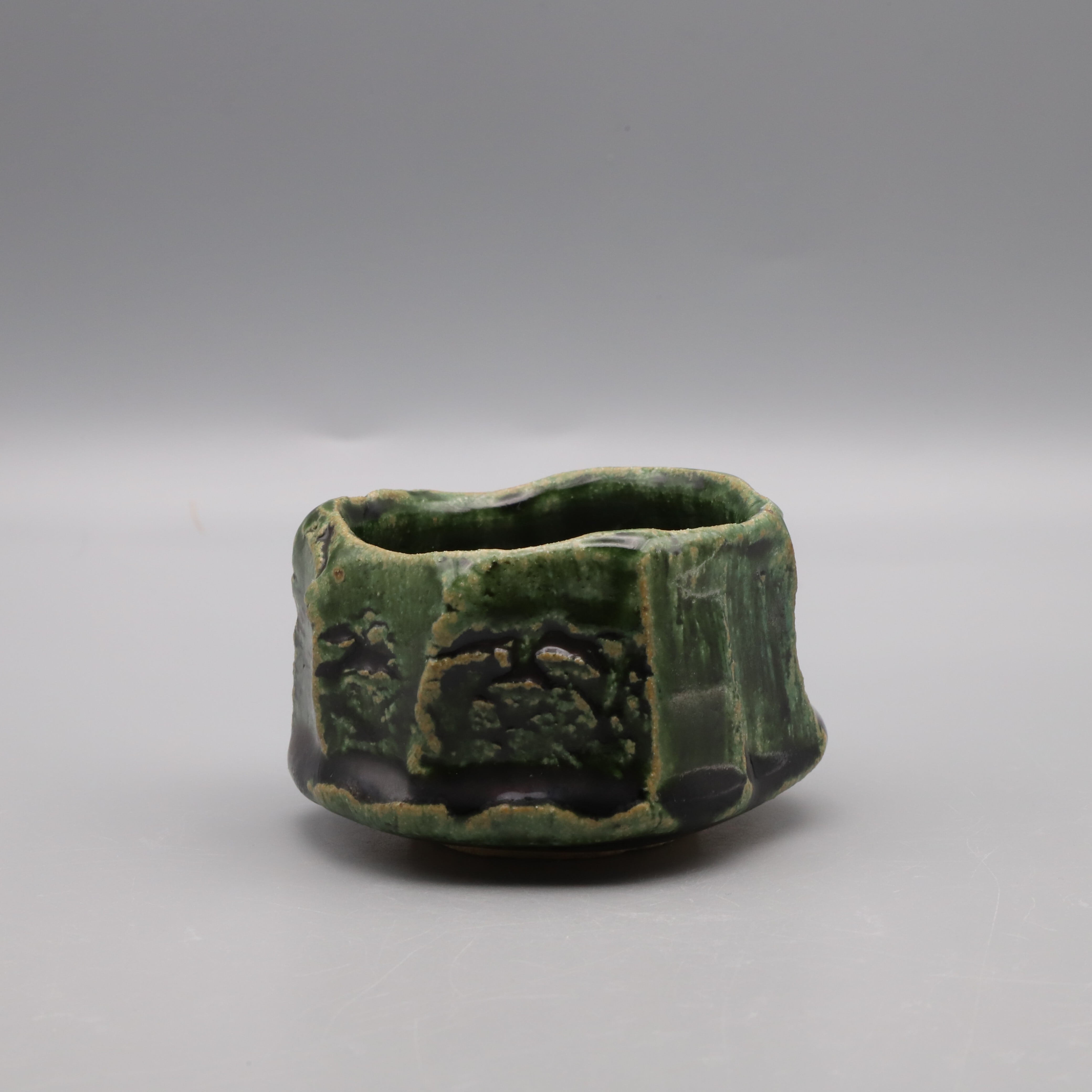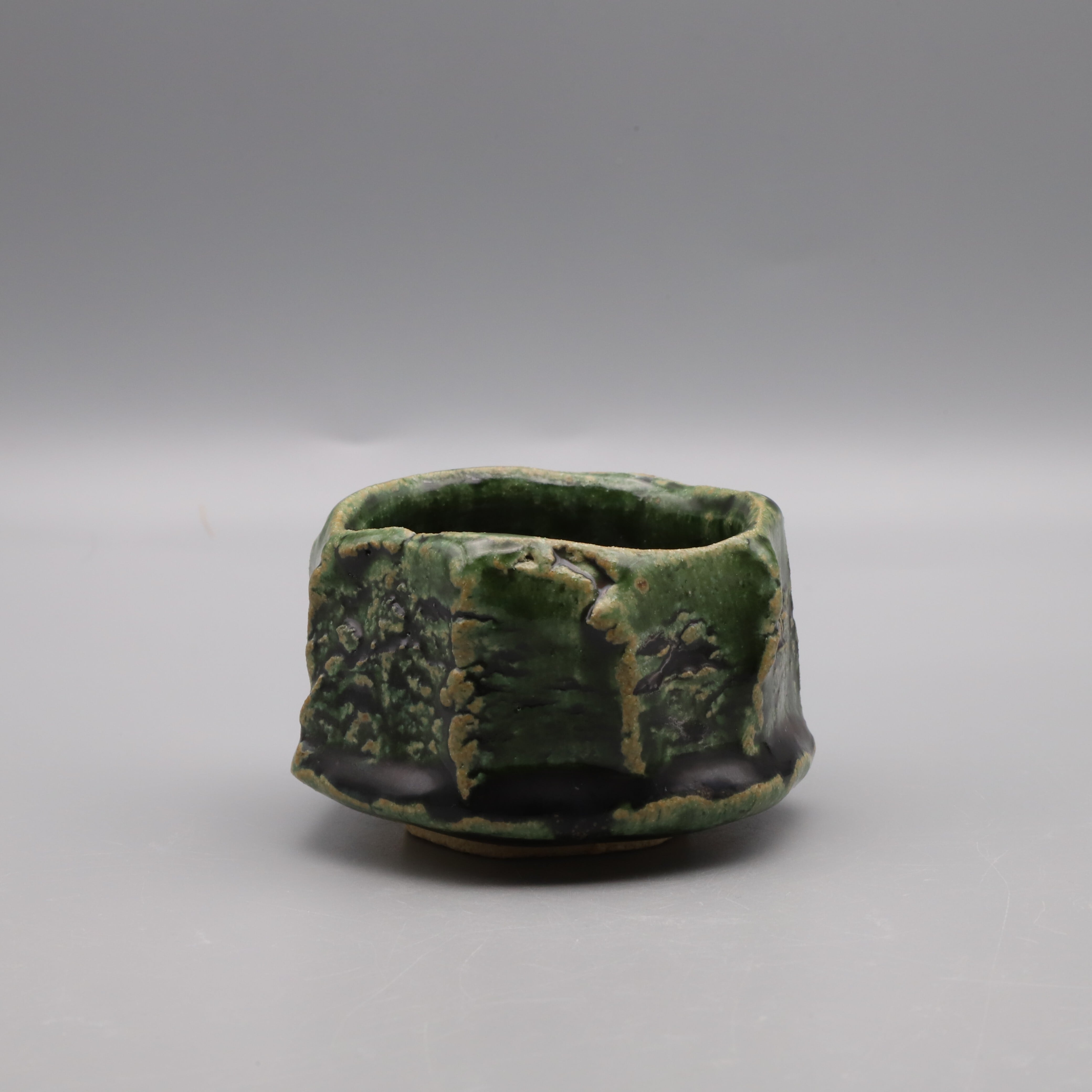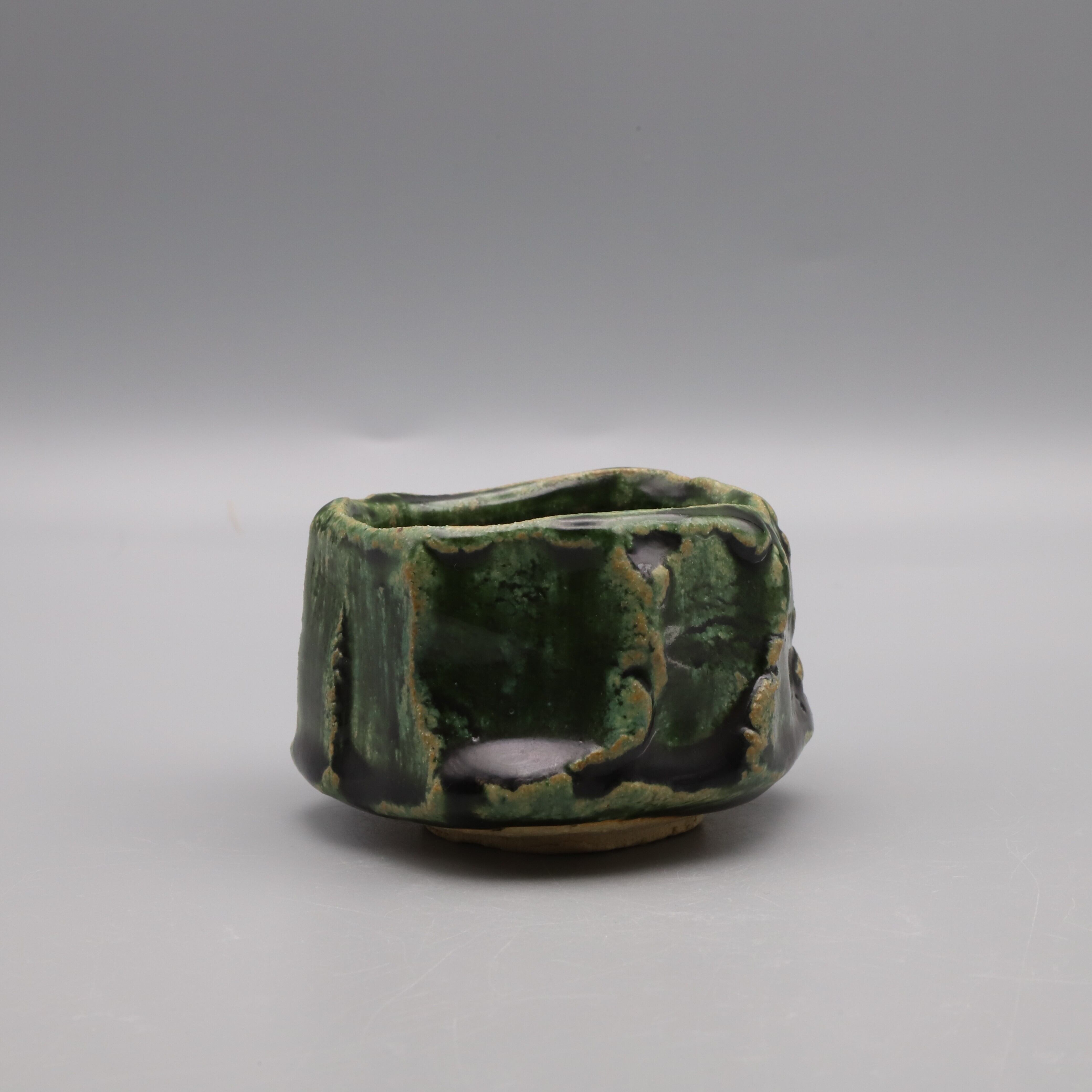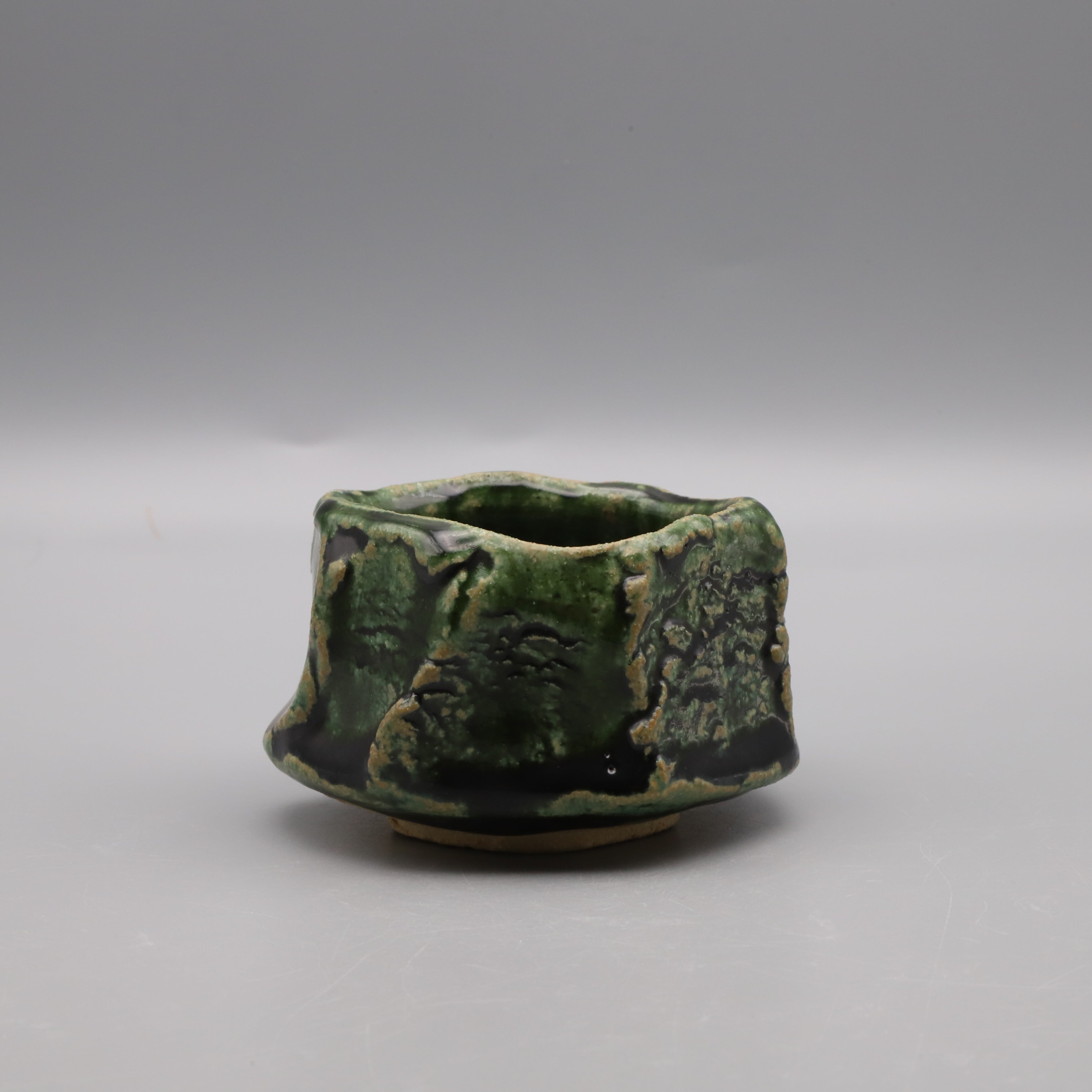 Oribe sake cup made by Osamu Taniguchi. It has a glossy dark green color, a slightly rough texture, and is meticulously shaped using a spatula. Taniguchi is strongly associated with Shino, he has recently been focusing on Oribe ware as well. This is an exceptional piece created with unwavering dedication and without any compromise.