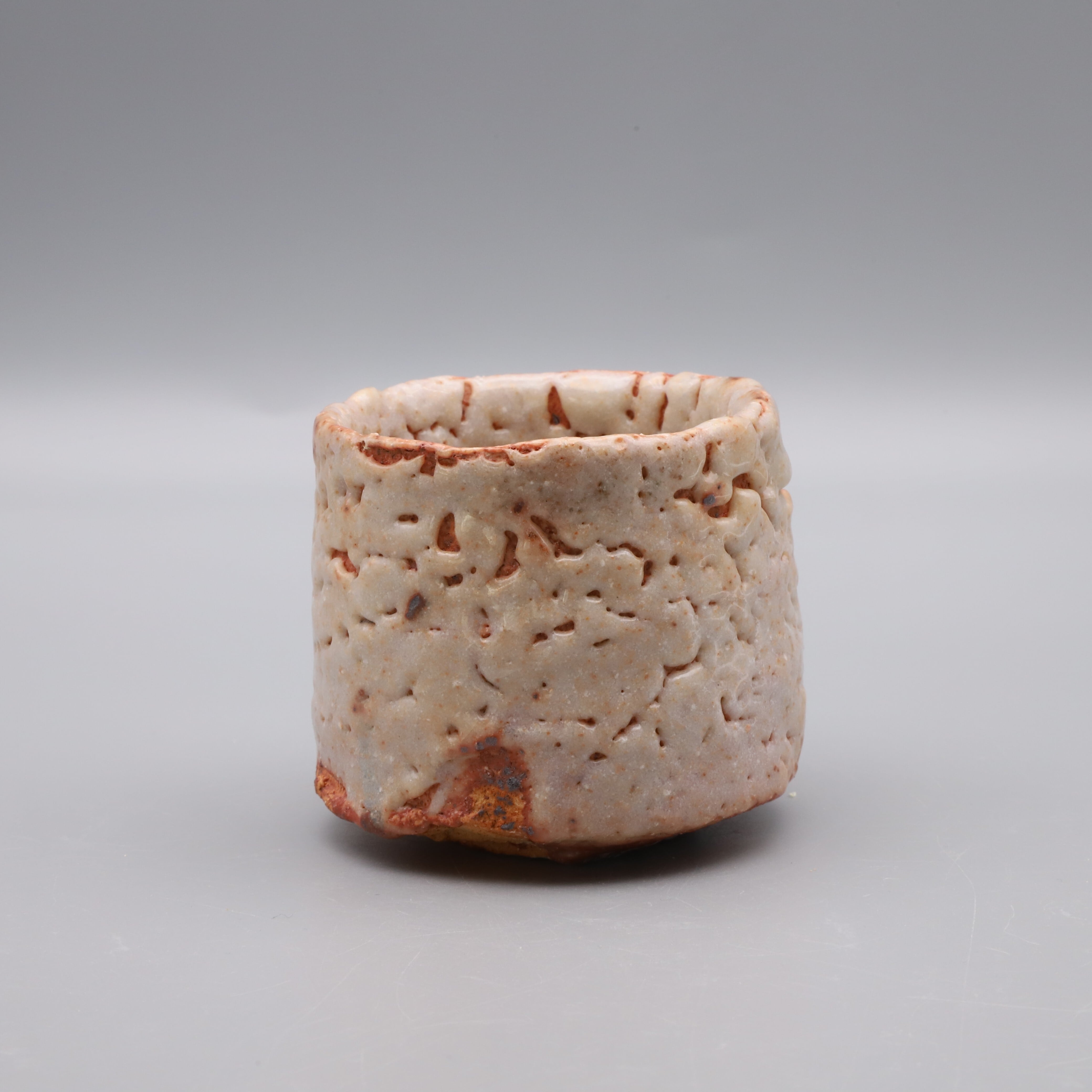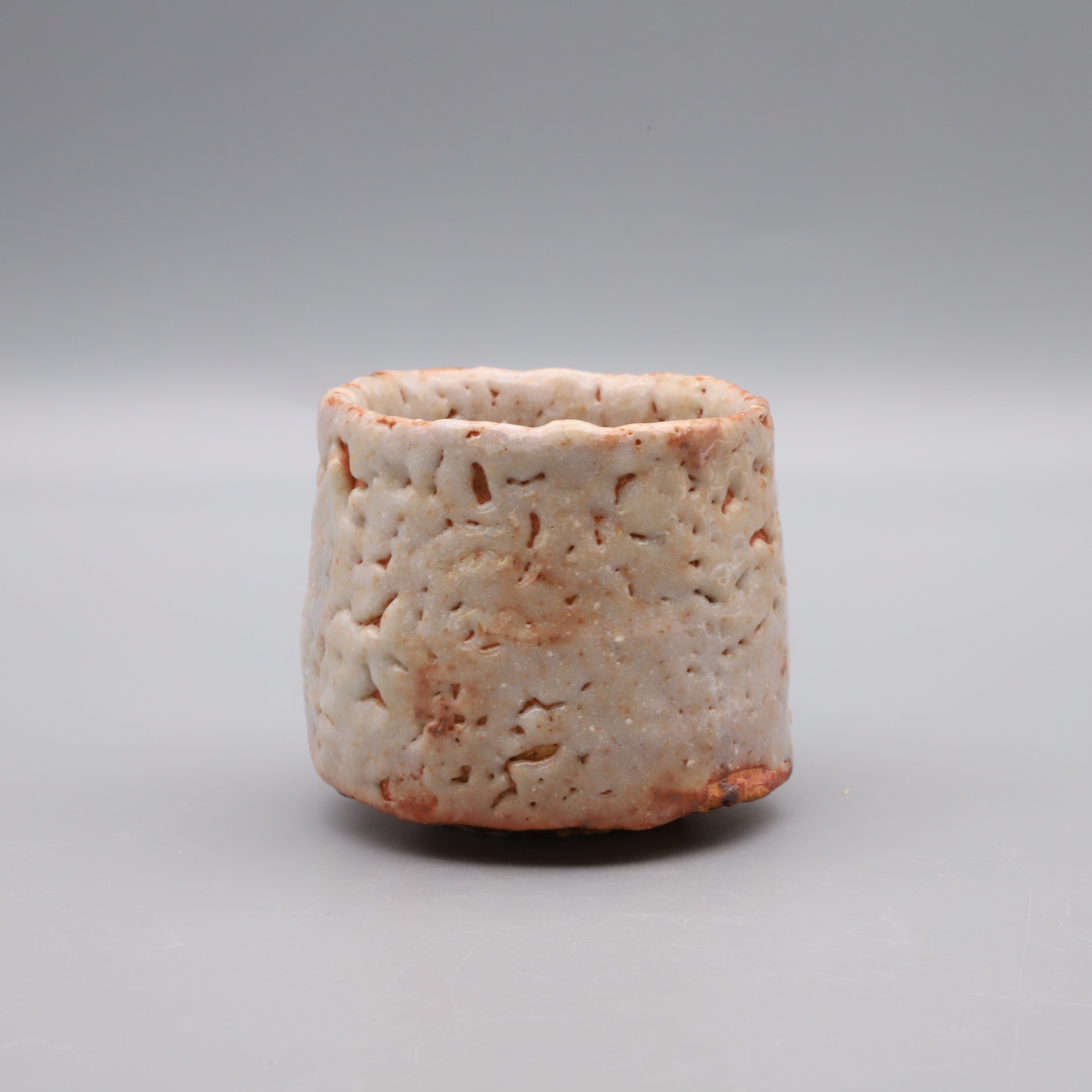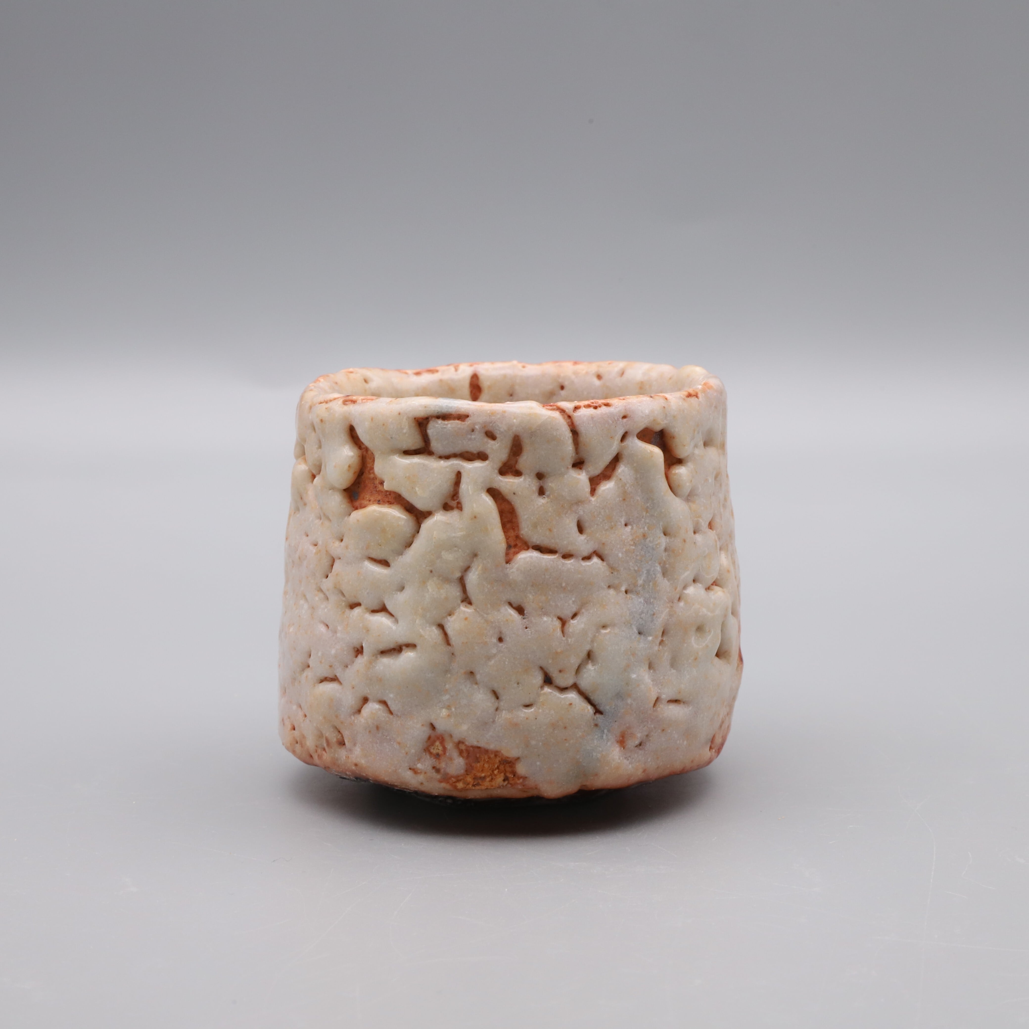 Shino guinomi (sake cup) made by Kyoho Seki. This piece features a thick application of white glaze, characterized by a coarse yuzu skin-like texture. Created in 2025, it was also exhibited at a joint solo exhibition held at Mitsukoshi the same year.