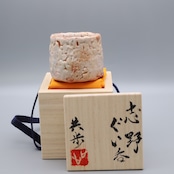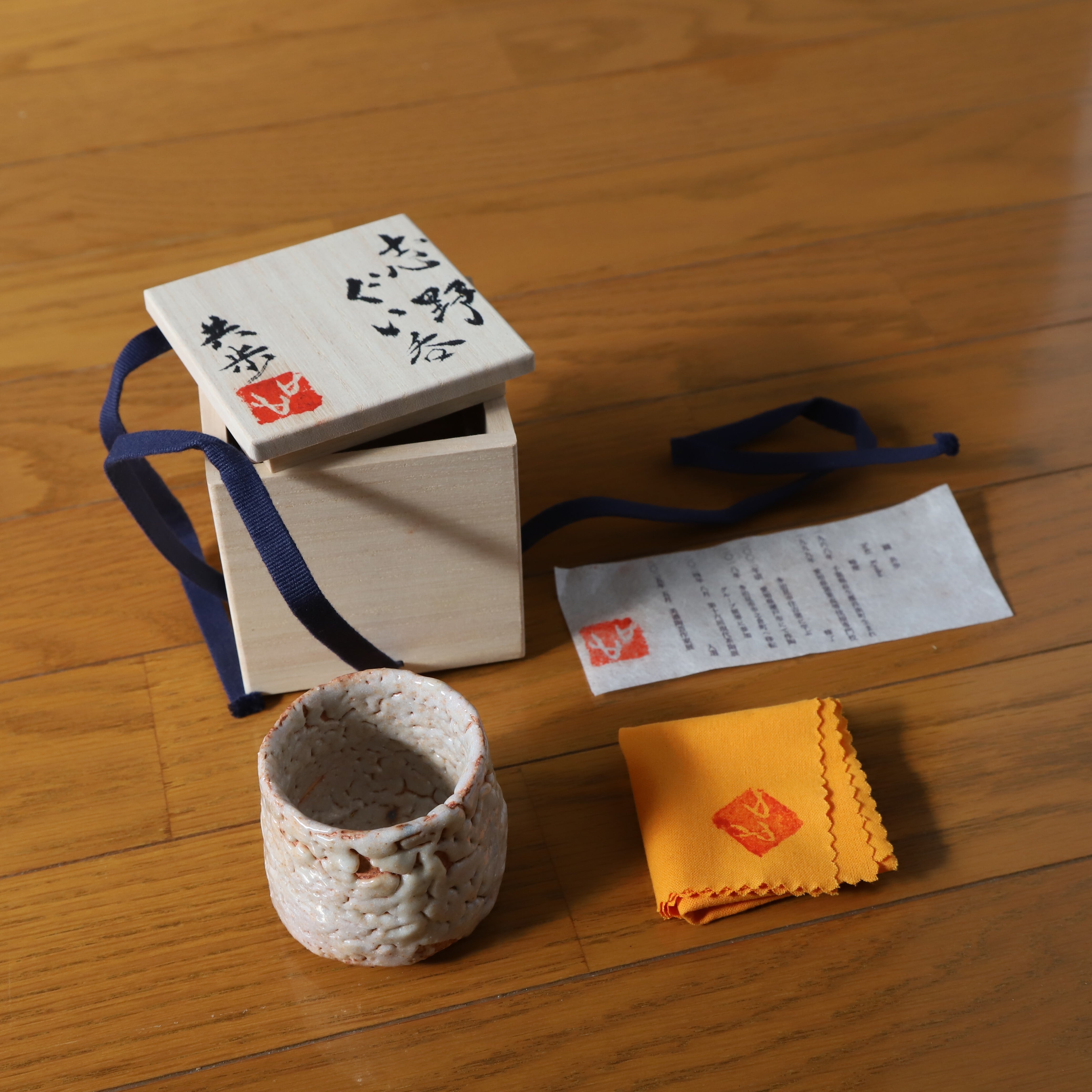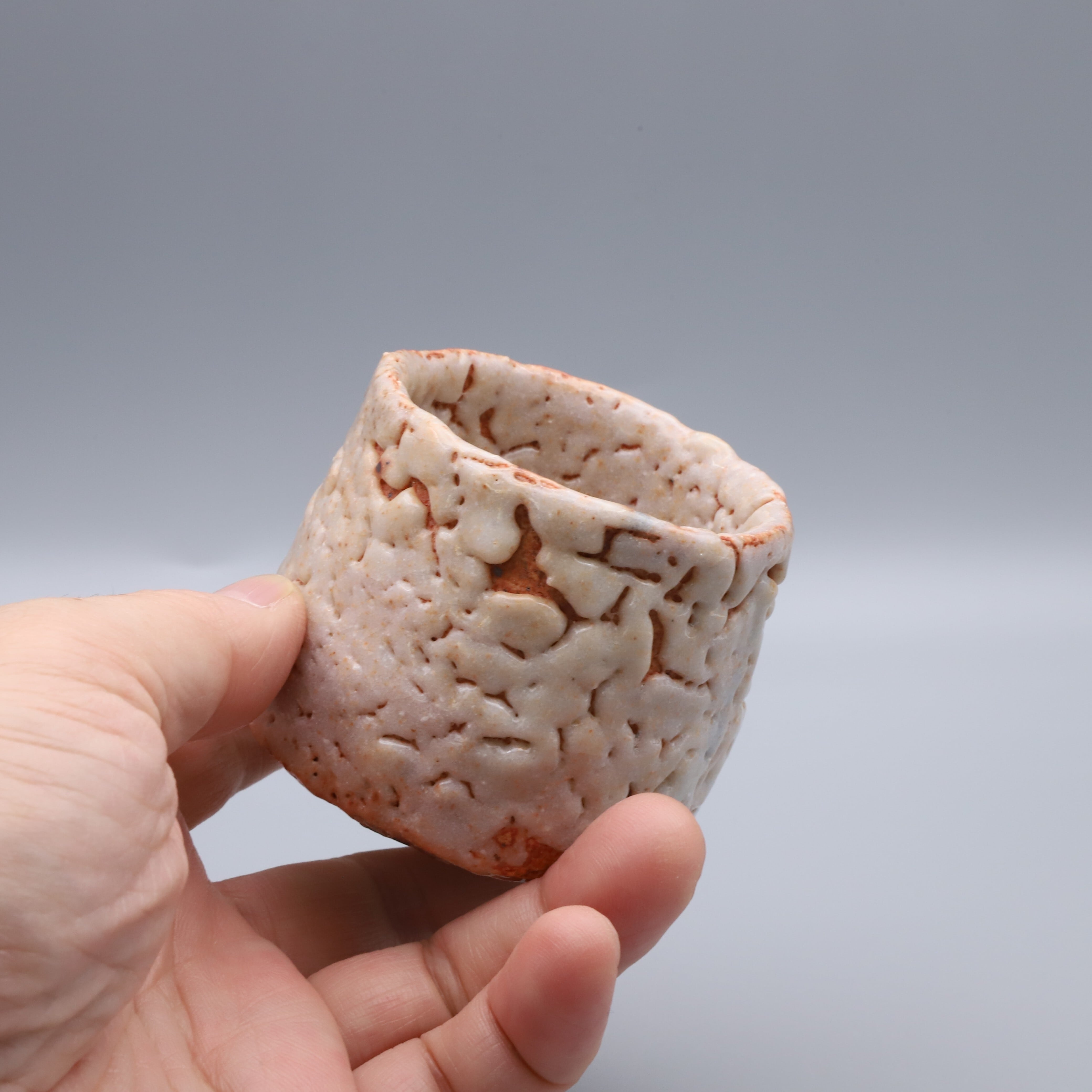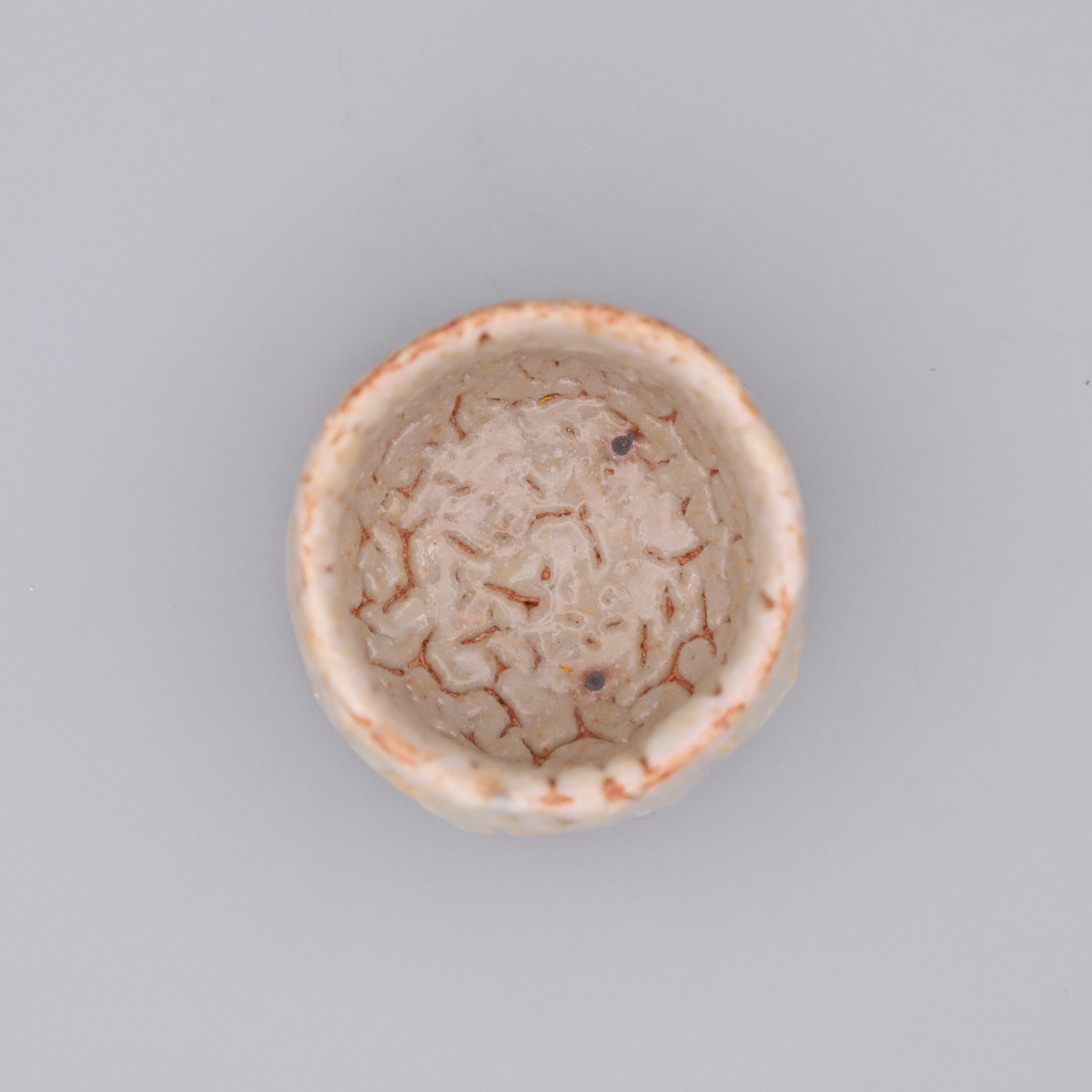 Shino guinomi (sake cup) made by Kyoho Seki. This piece features a thick application of white glaze, characterized by a coarse yuzu skin-like texture. Created in 2025, it was also exhibited at a joint solo exhibition held at Mitsukoshi the same year.
