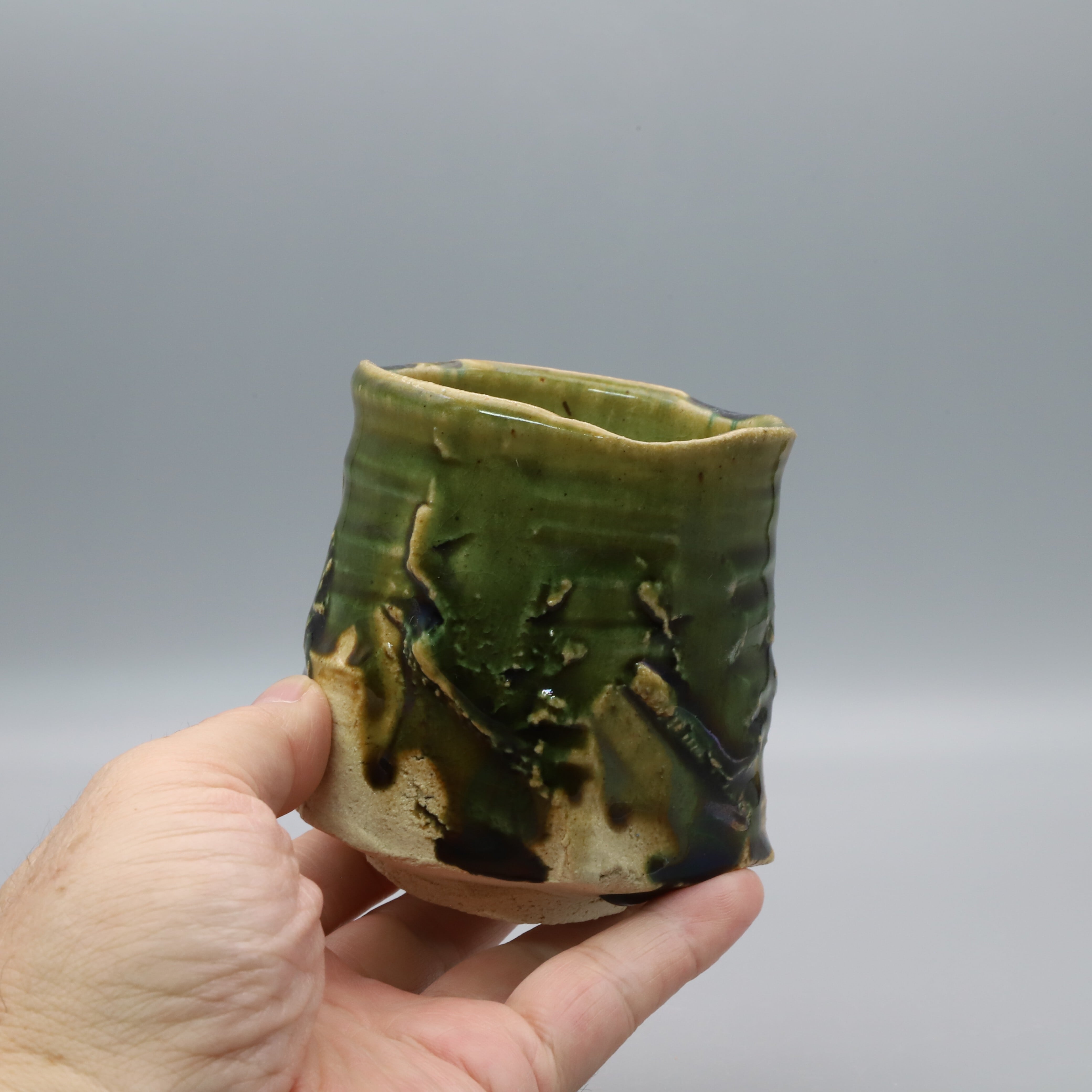 Oribe teacup made by Masakazu Yamada of the long-established Hakusan Kiln in Toki City. This is a wonderful piece crafted by a master artisan, featuring a glossy dark green Oribe glaze and shaped using a hera-tori (scraping) technique.