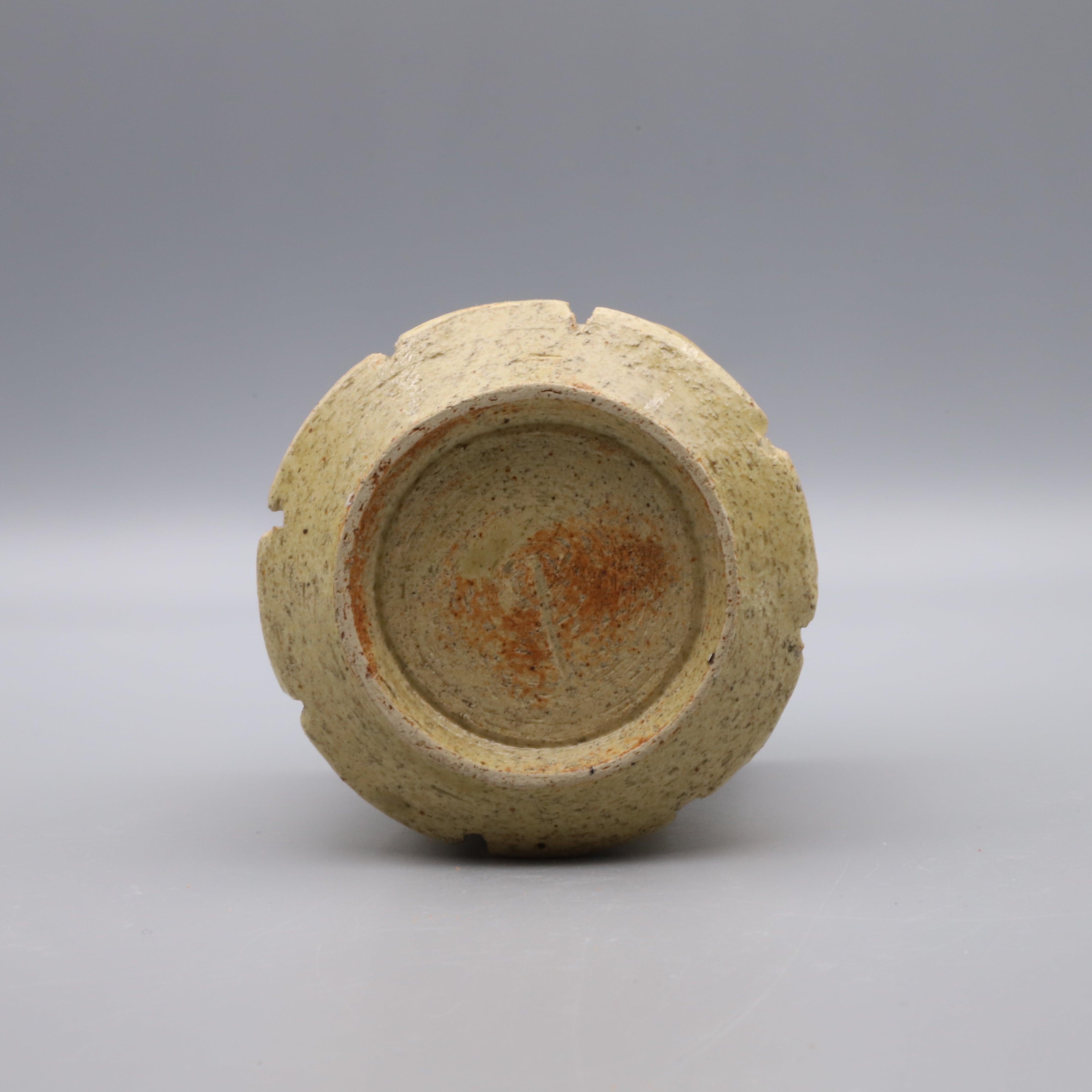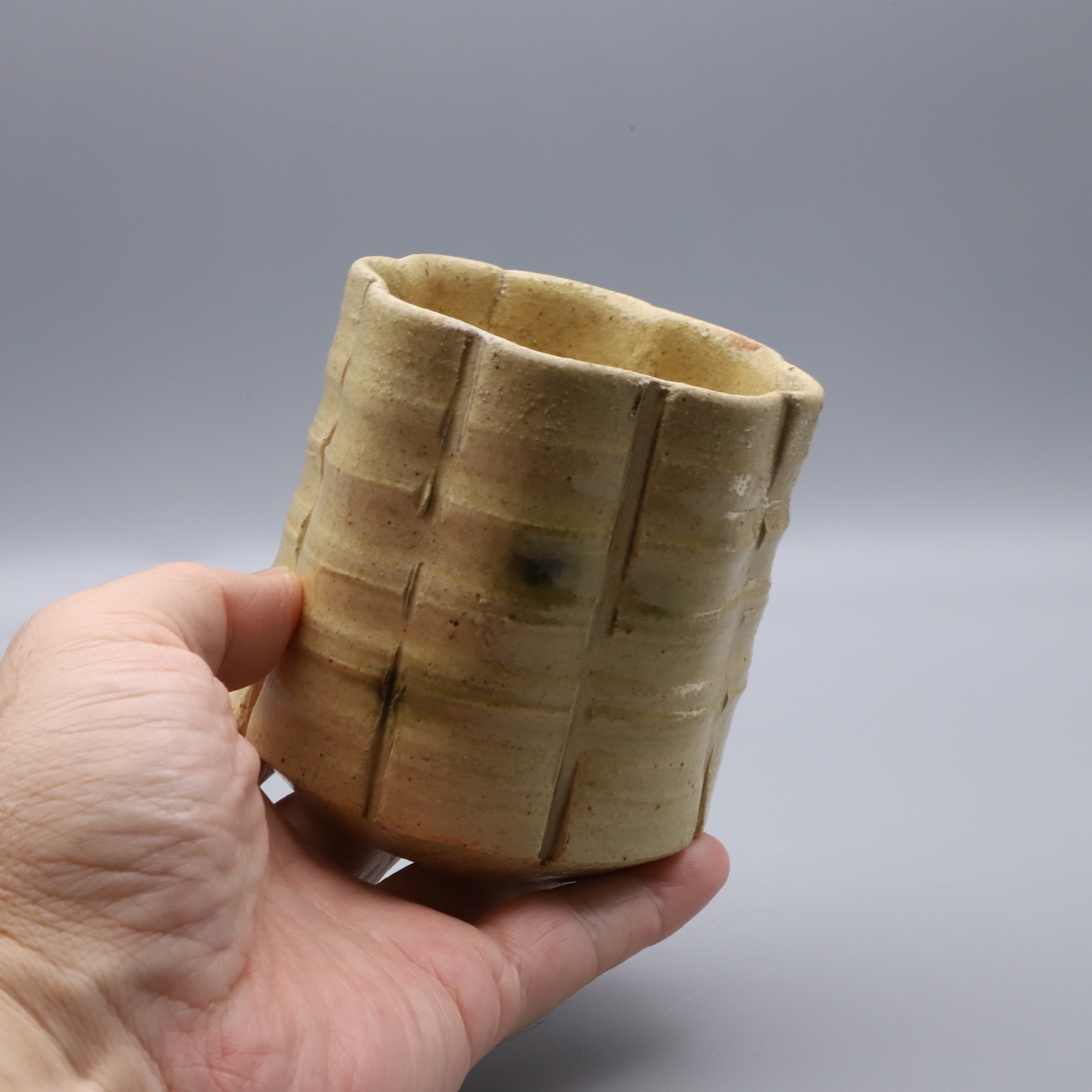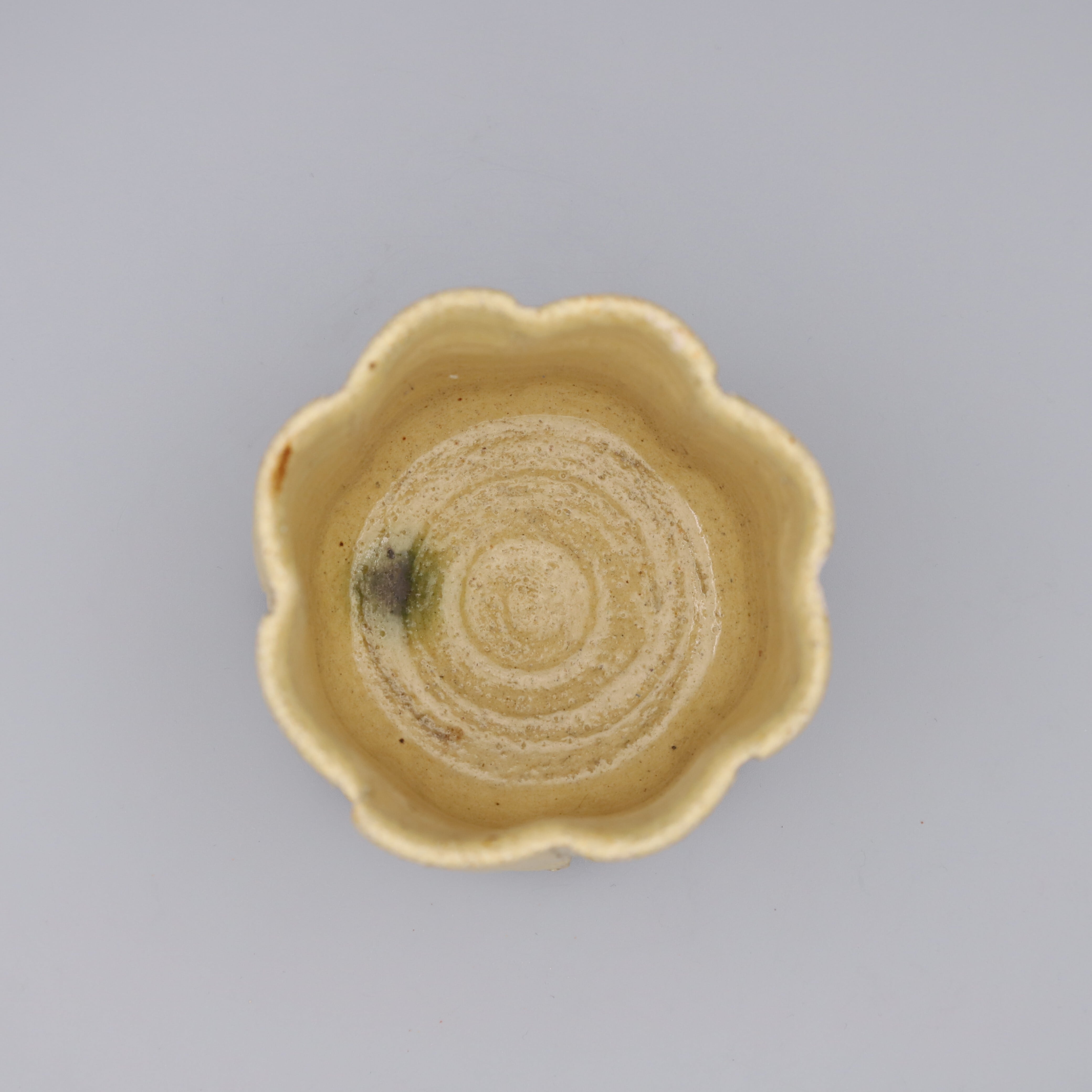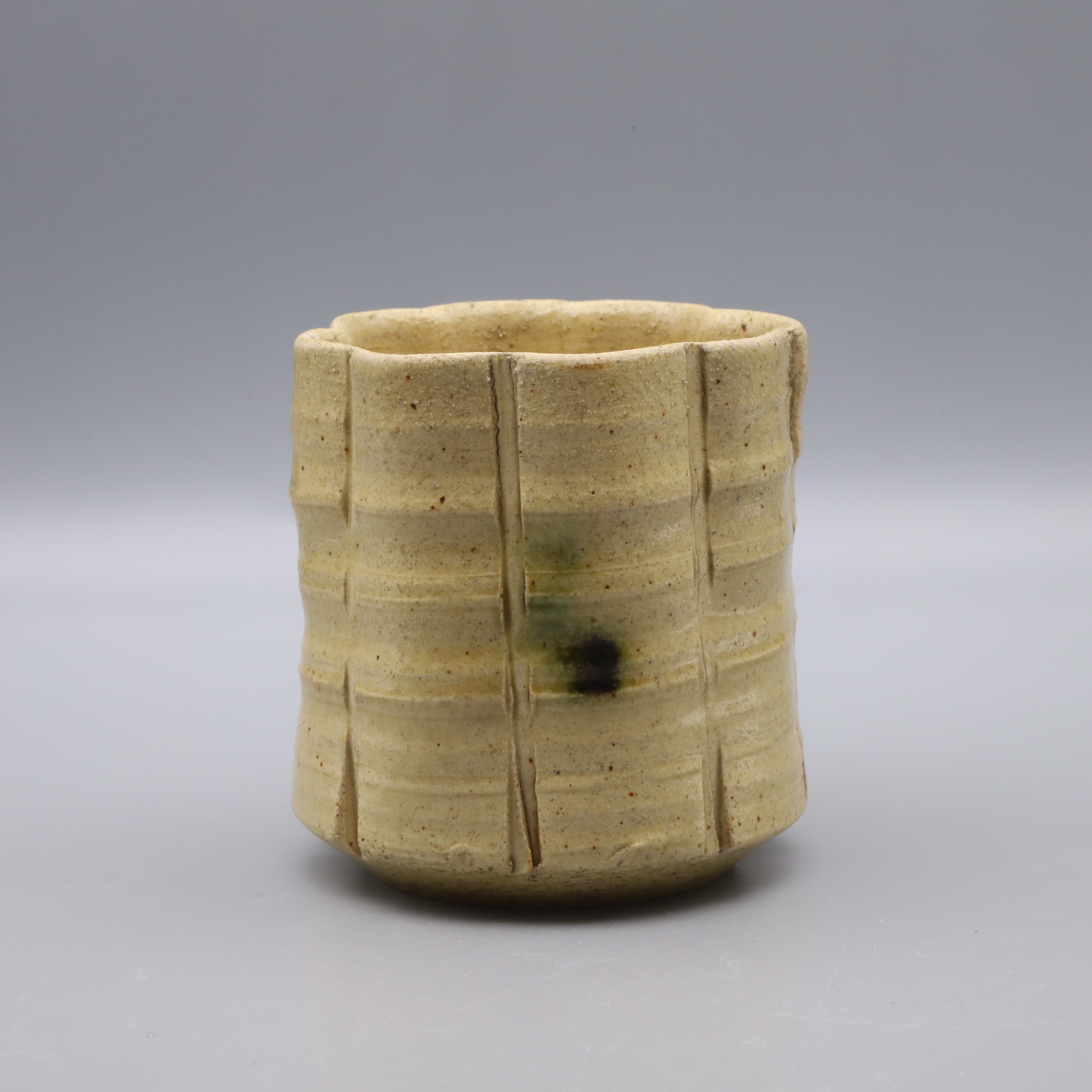 土岐市で長い歴史のある白山窯 山田 正和作陶、黄瀬戸湯呑です。花びらのような口縁と、胴回りを箆取りで成形された、名匠が造り出す素晴らしい作品です。