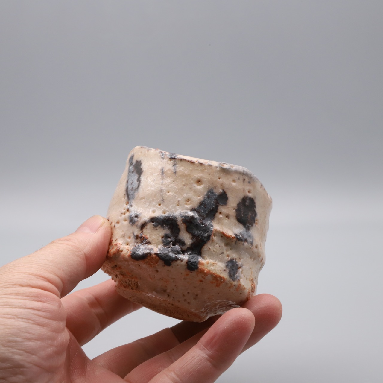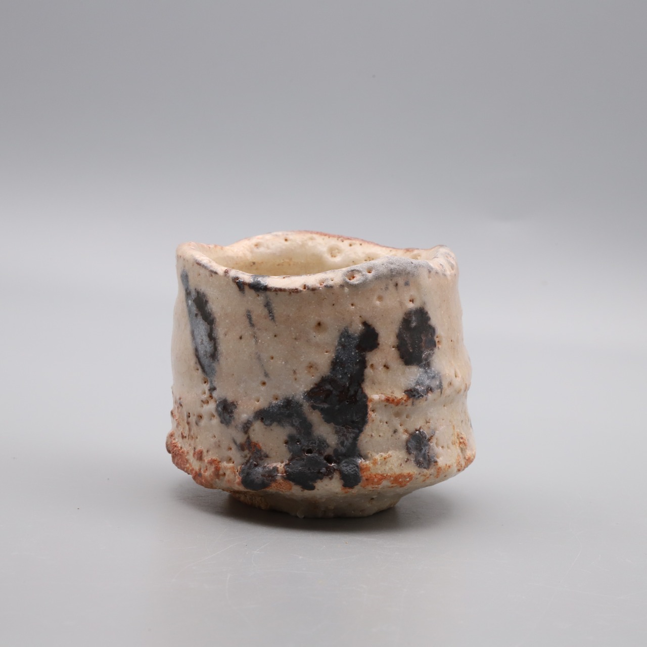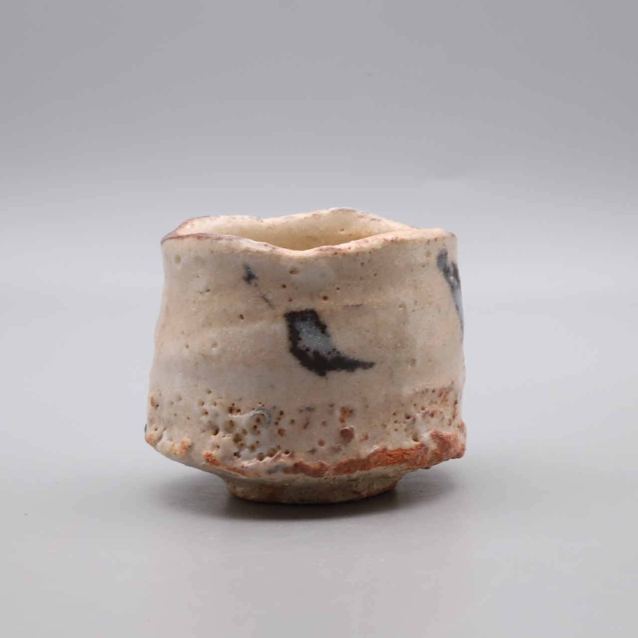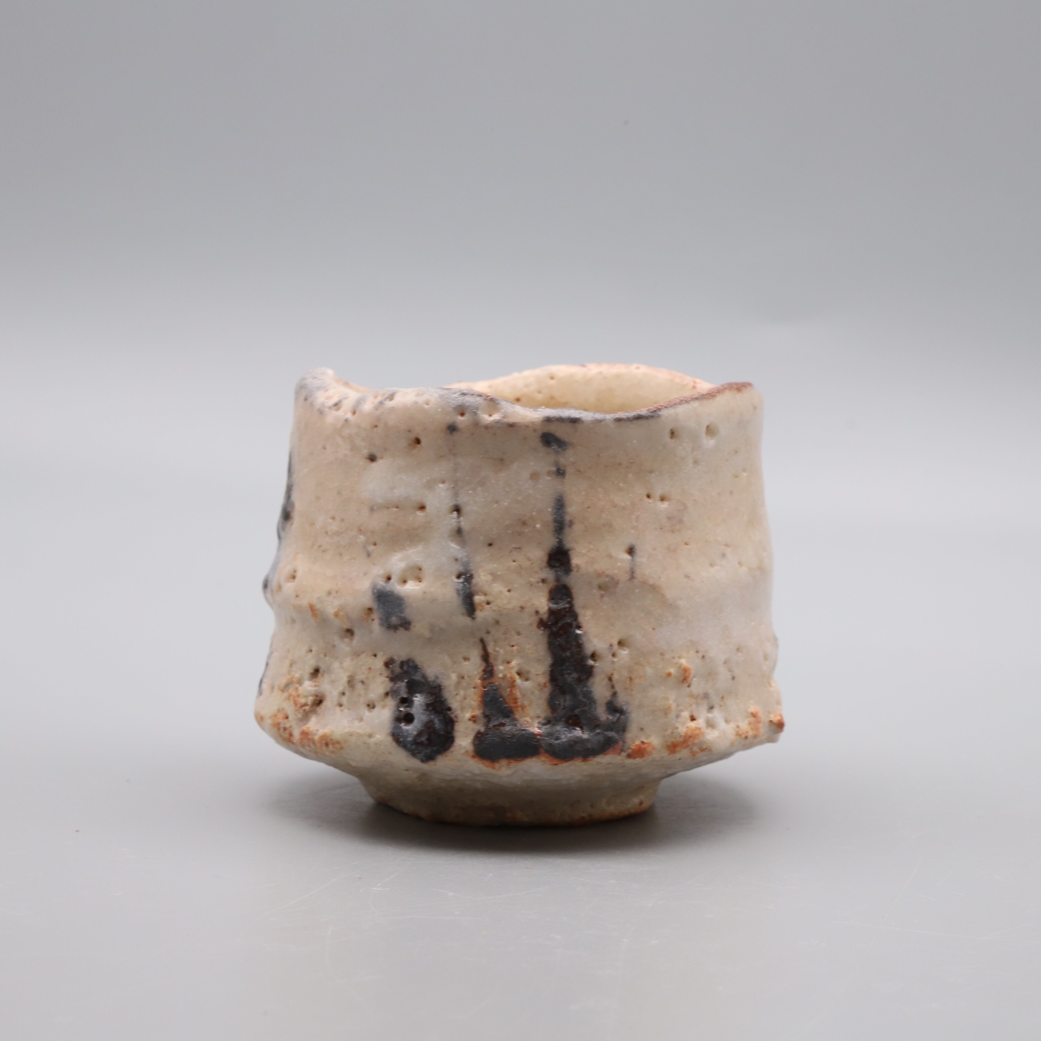 關 共歩作陶、志野ぐい吞、2026年の新作です。薄いピンク地にダイナミックに描かれた鉄絵に力強さを感じる作品です。