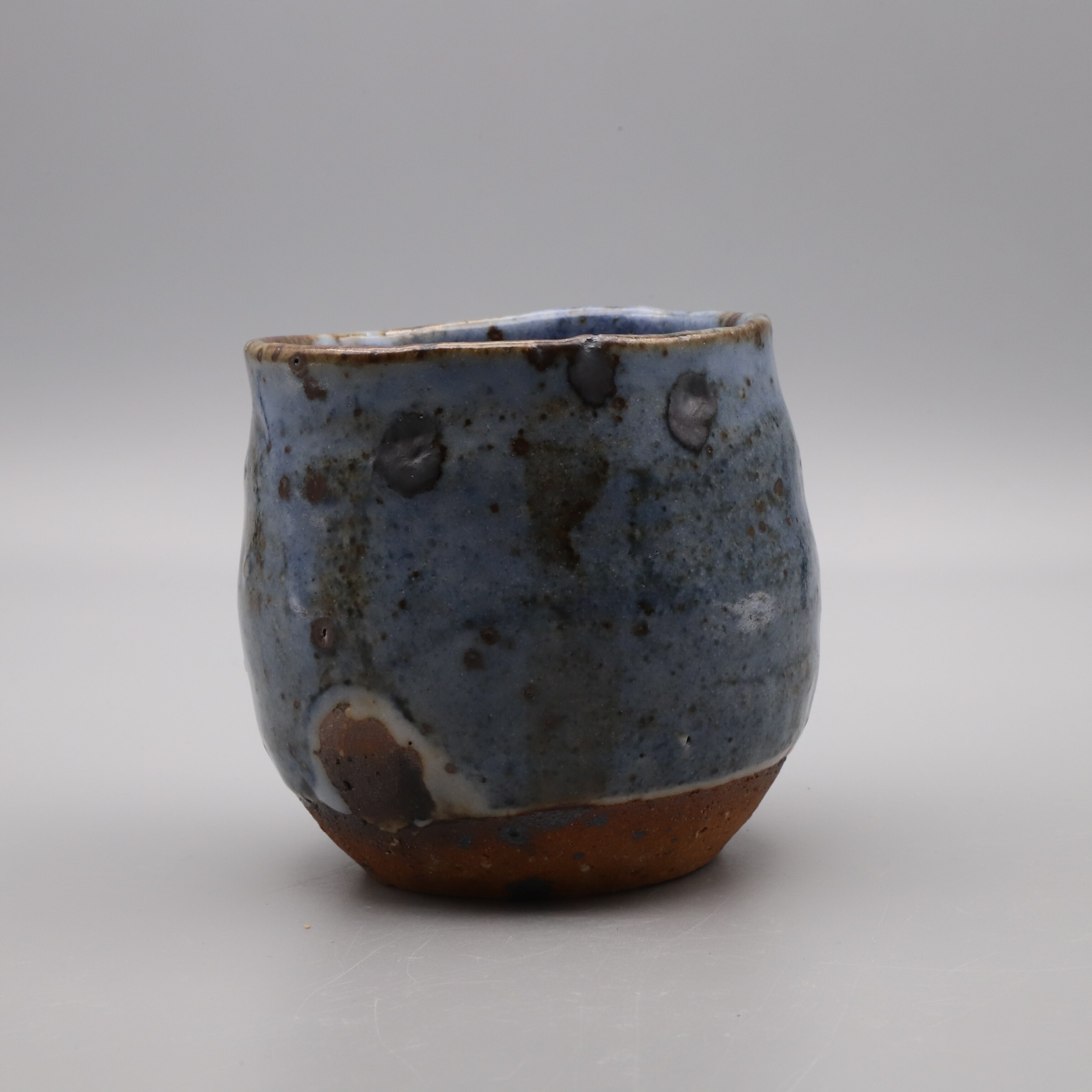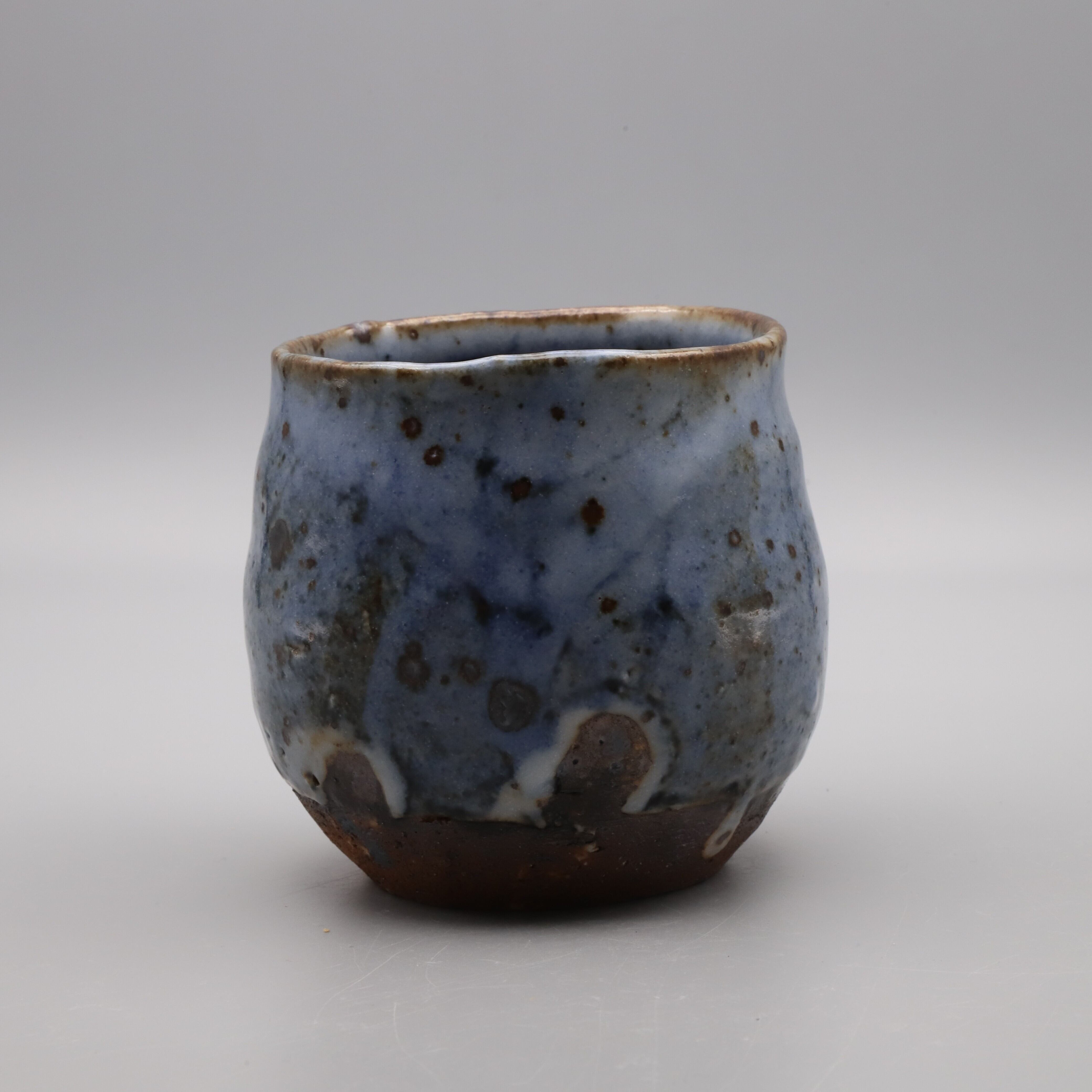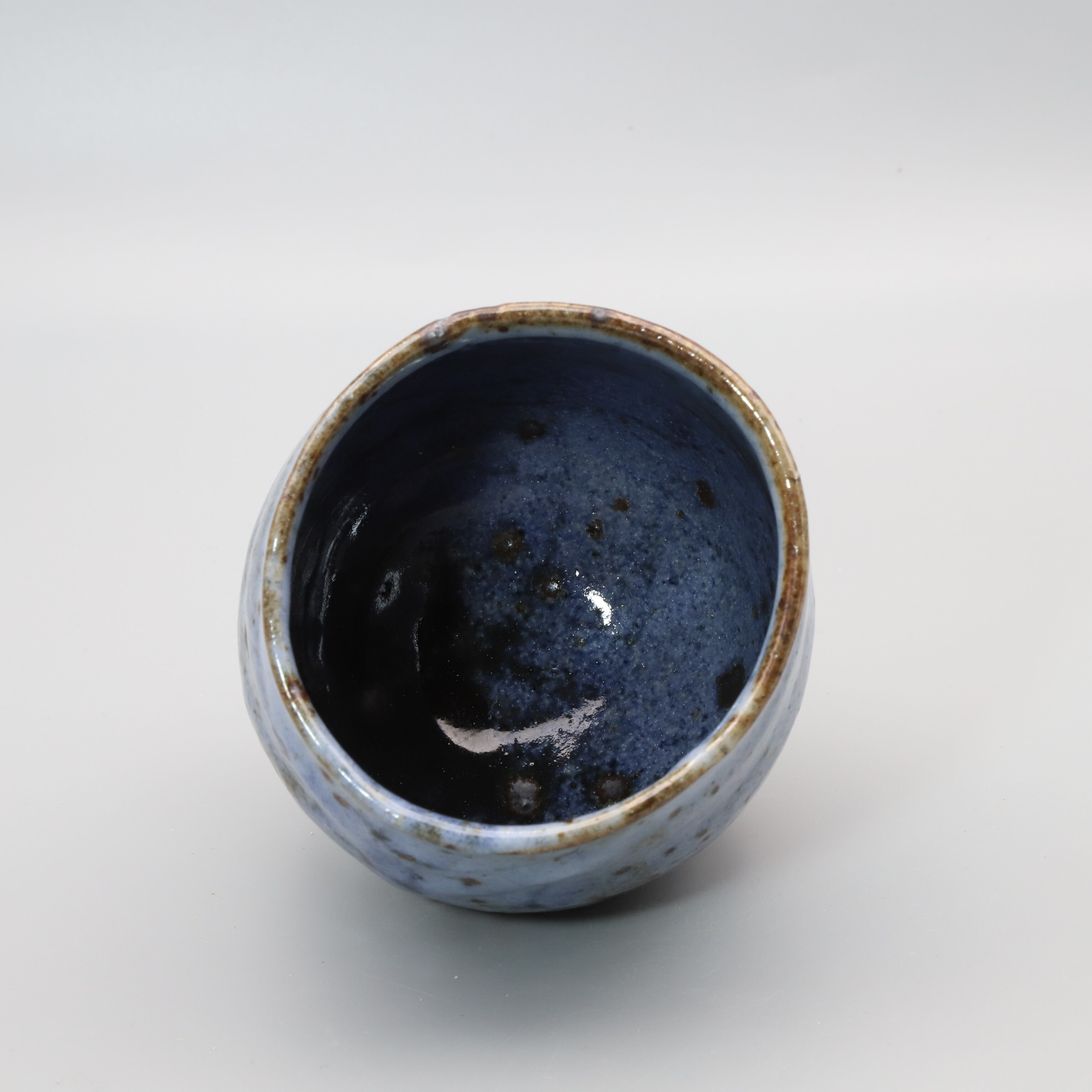 Ai (indigo) shino shochu cup made by Morio Asahi. It can be used freely in a variety of ways, such as a rocks glass for whiskey. Aishino is characterized by beautiful cobalt blue glaze with drips of white glaze, achieved by using both feldspar glaze and cobalt glaze. Furthermore, by using clay blended with iron sand particles in the base, a contrast is created between the scorched, blackened iron sand particles and the indigo blue color. Ai shino is an original work by Asahi.