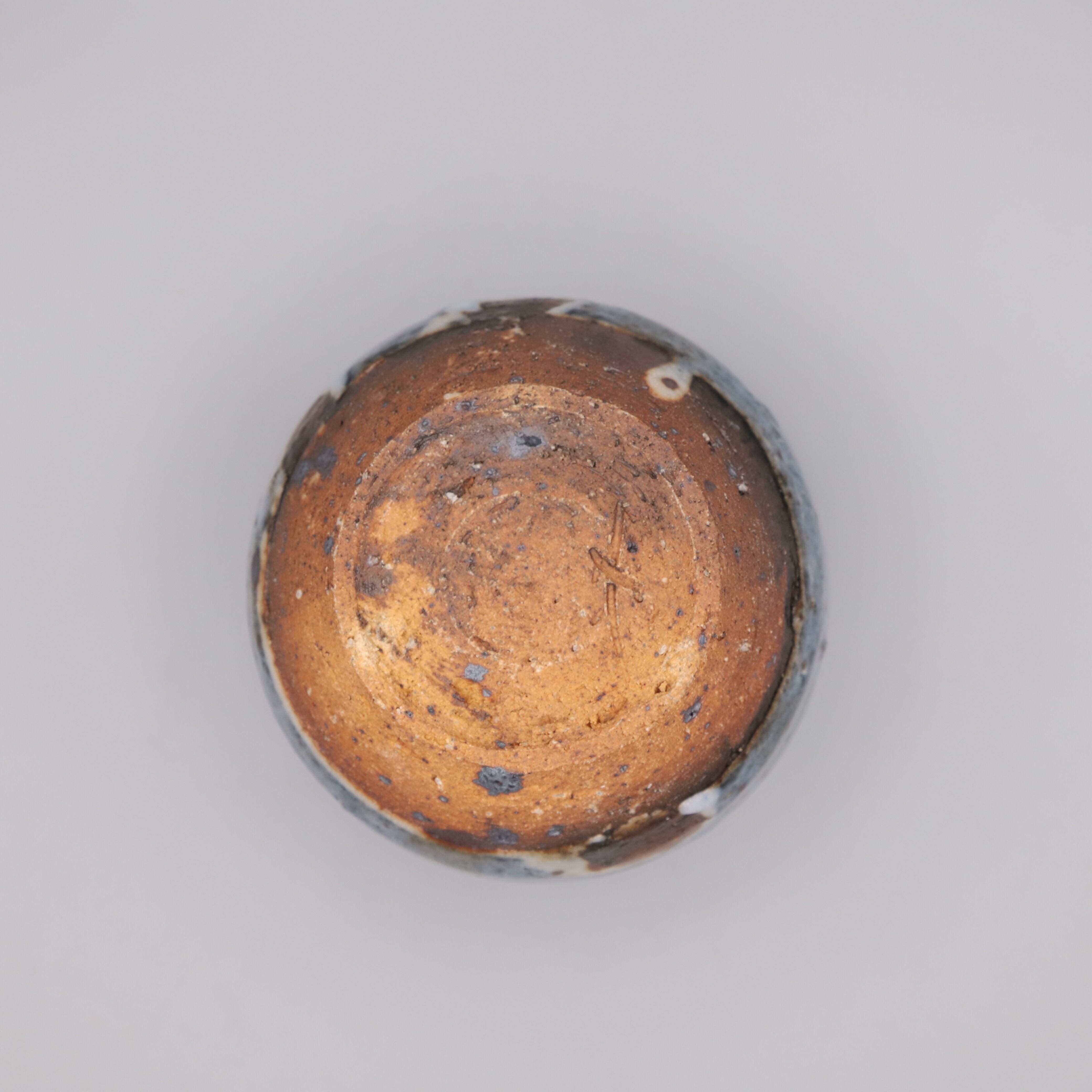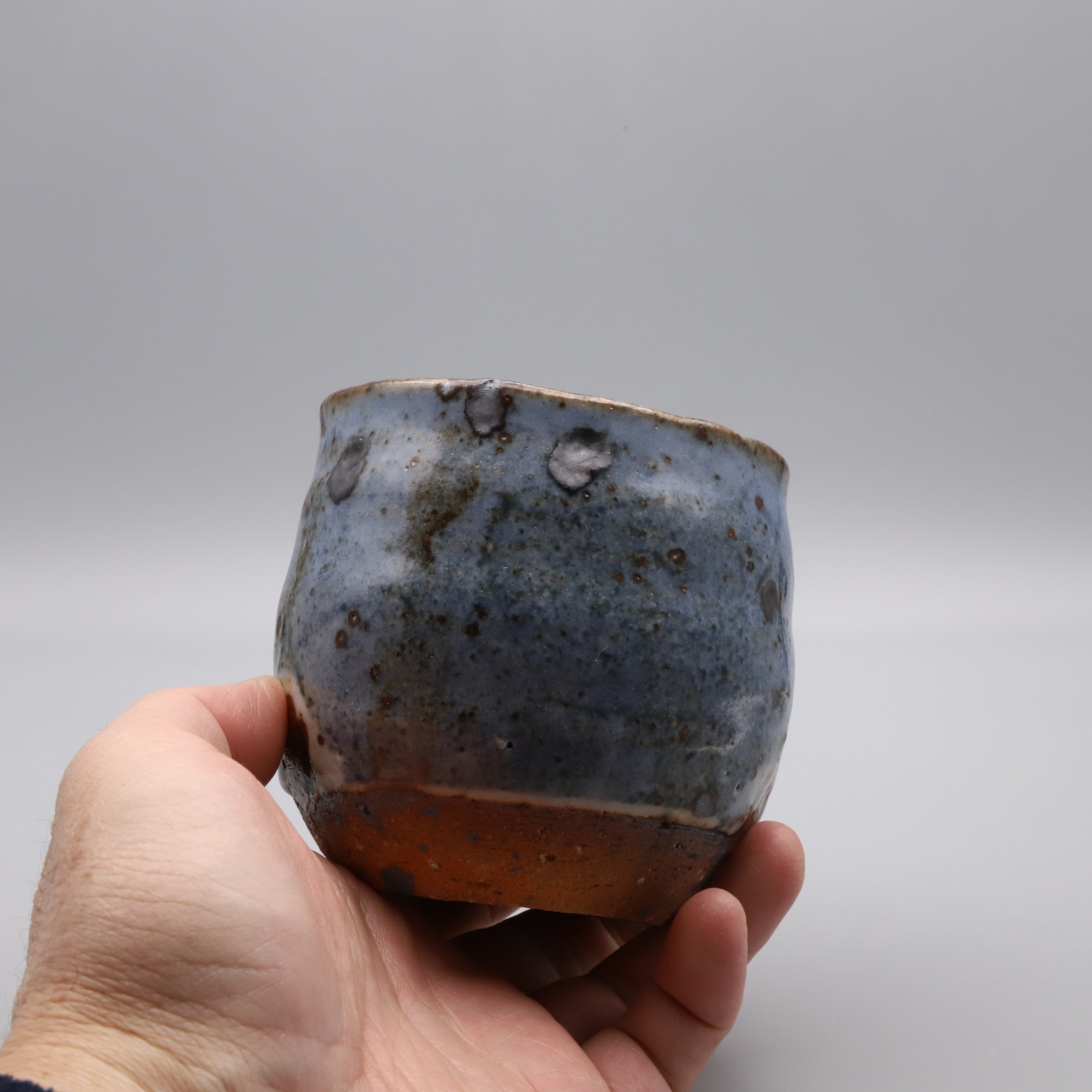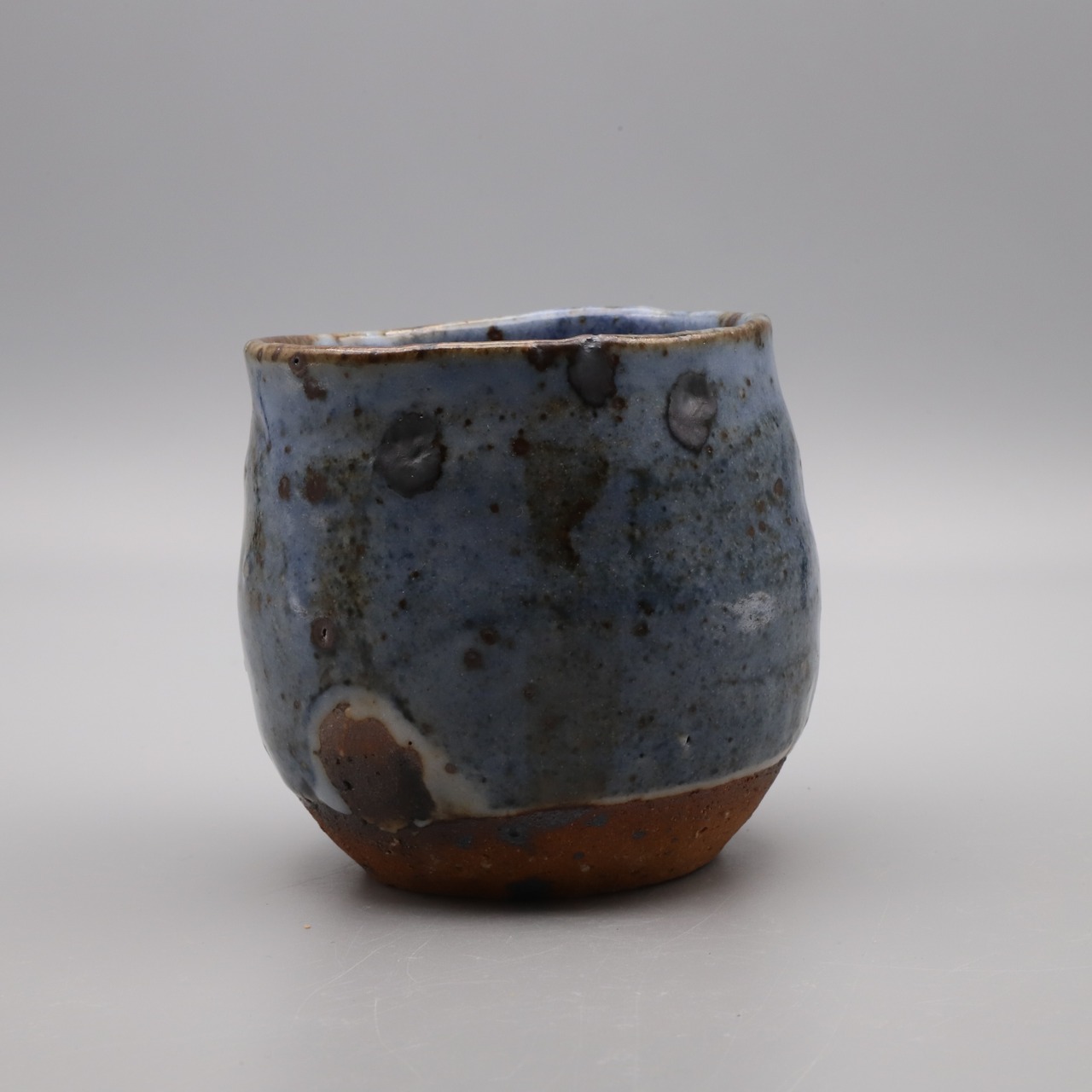 Ai (indigo) shino shochu cup made by Morio Asahi. It can be used freely in a variety of ways, such as a rocks glass for whiskey. Aishino is characterized by beautiful cobalt blue glaze with drips of white glaze, achieved by using both feldspar glaze and cobalt glaze. Furthermore, by using clay blended with iron sand particles in the base, a contrast is created between the scorched, blackened iron sand particles and the indigo blue color. Ai shino is an original work by Asahi.