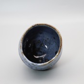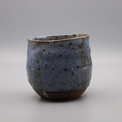 旭 守男作陶、藍志野 焼酎杯です。ウイスキーのロックグラスなど自由な発想でお使いいただけます。藍志野は、長石釉とコバルト釉を用いることで、美しいコバルトブルーの中に白釉の垂れが特徴です。さらに、素地に鬼板粒をブレンドした土を使うことで、焦げて黒くなった板粒と藍色のコントラストが生まれます。藍志野は旭先生のオリジナル作品です。