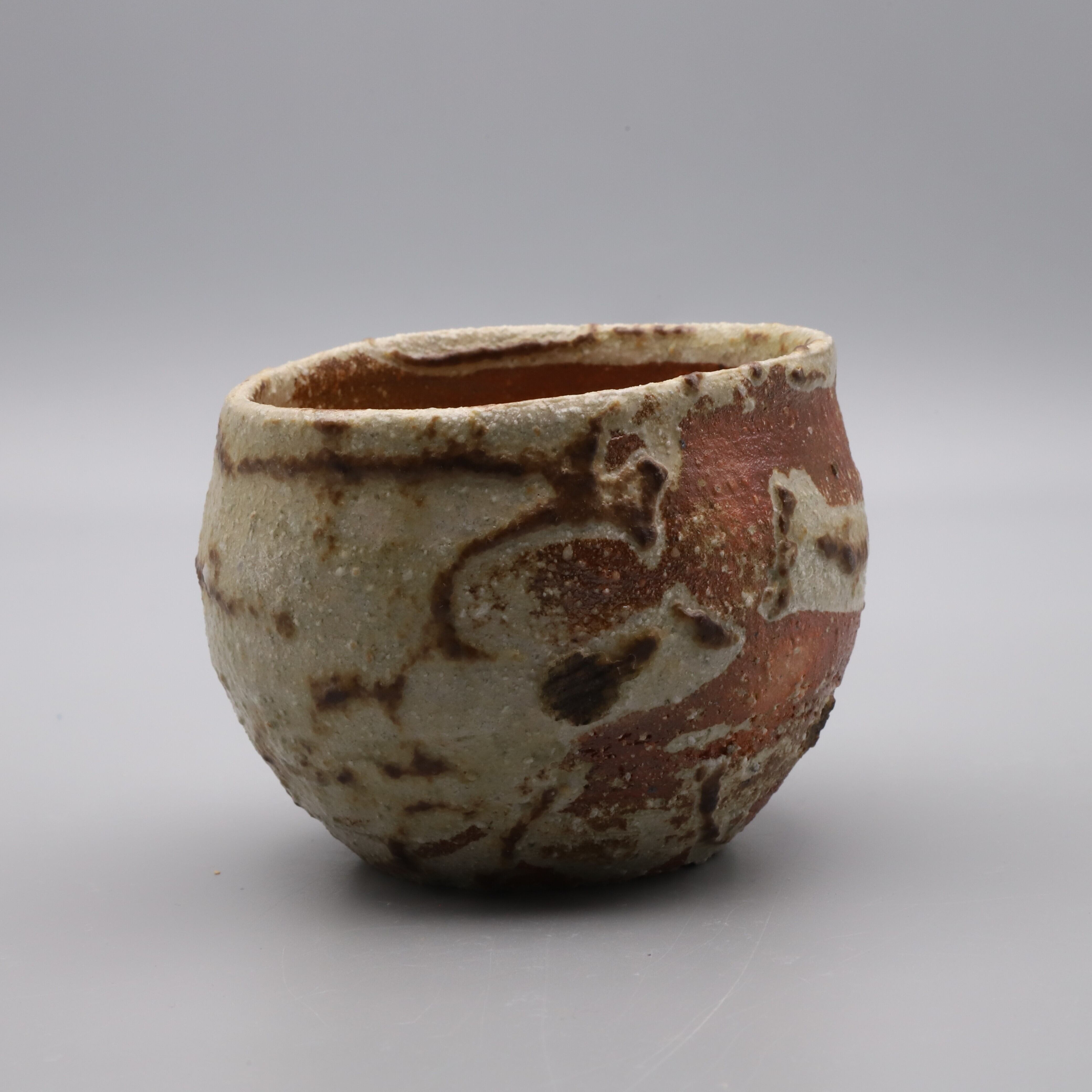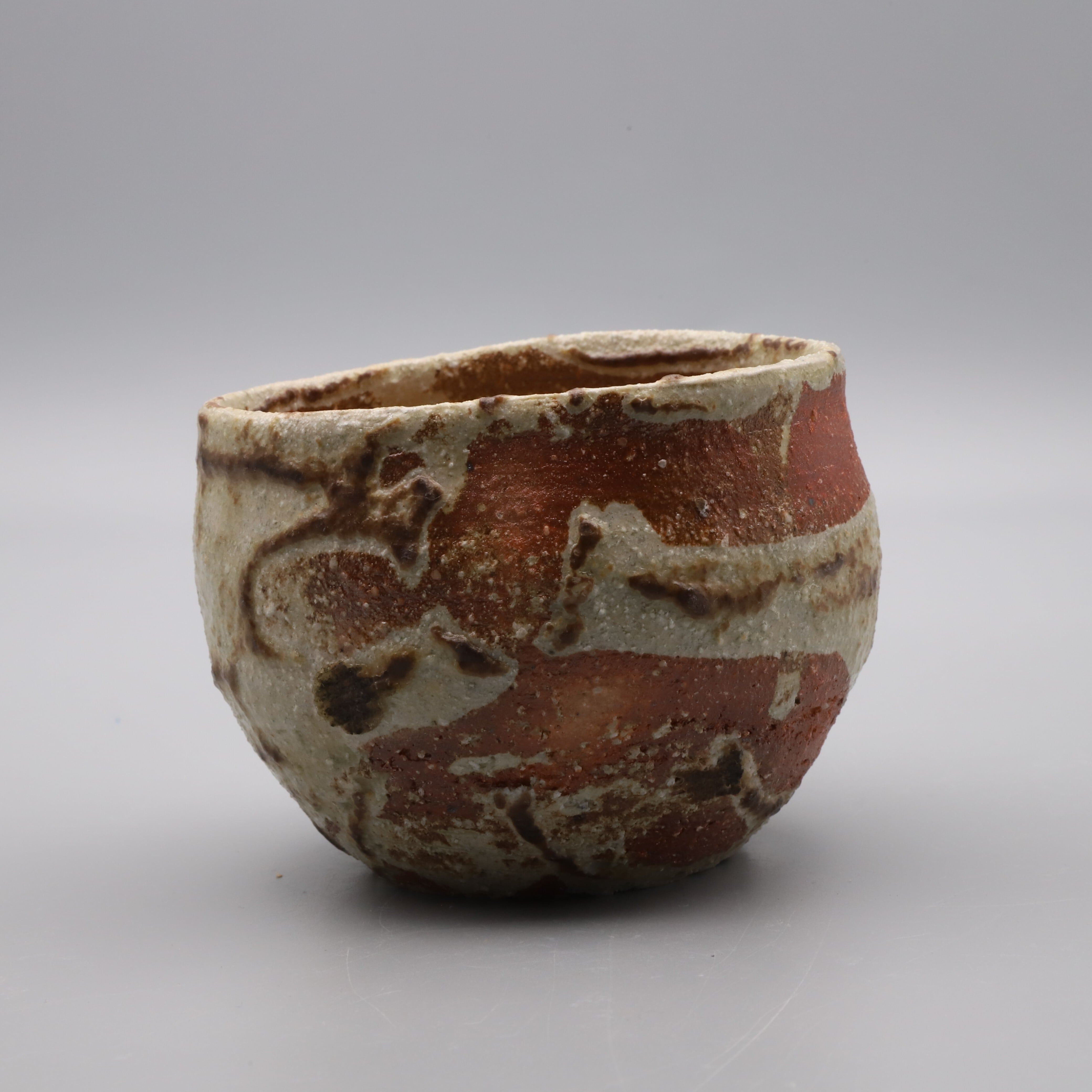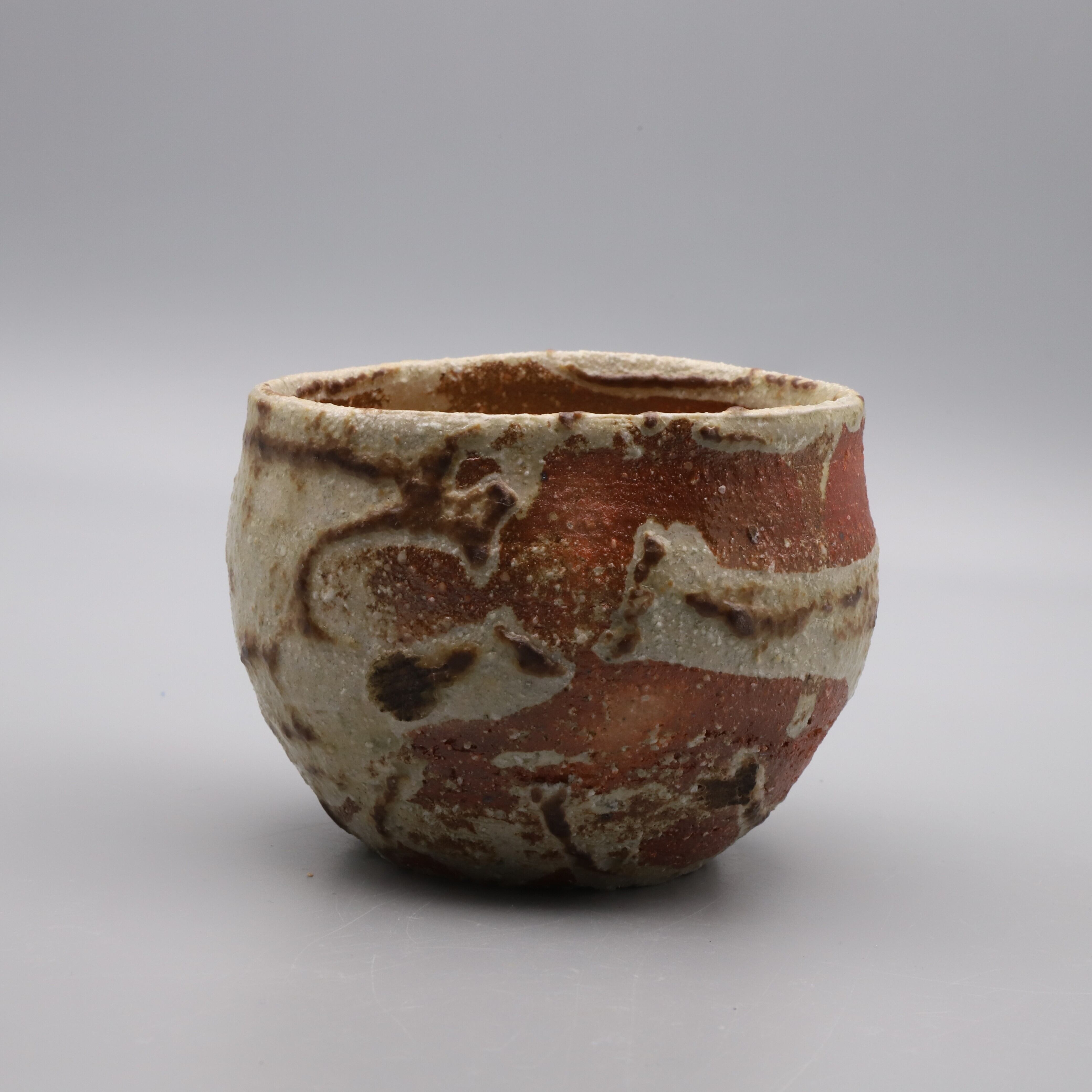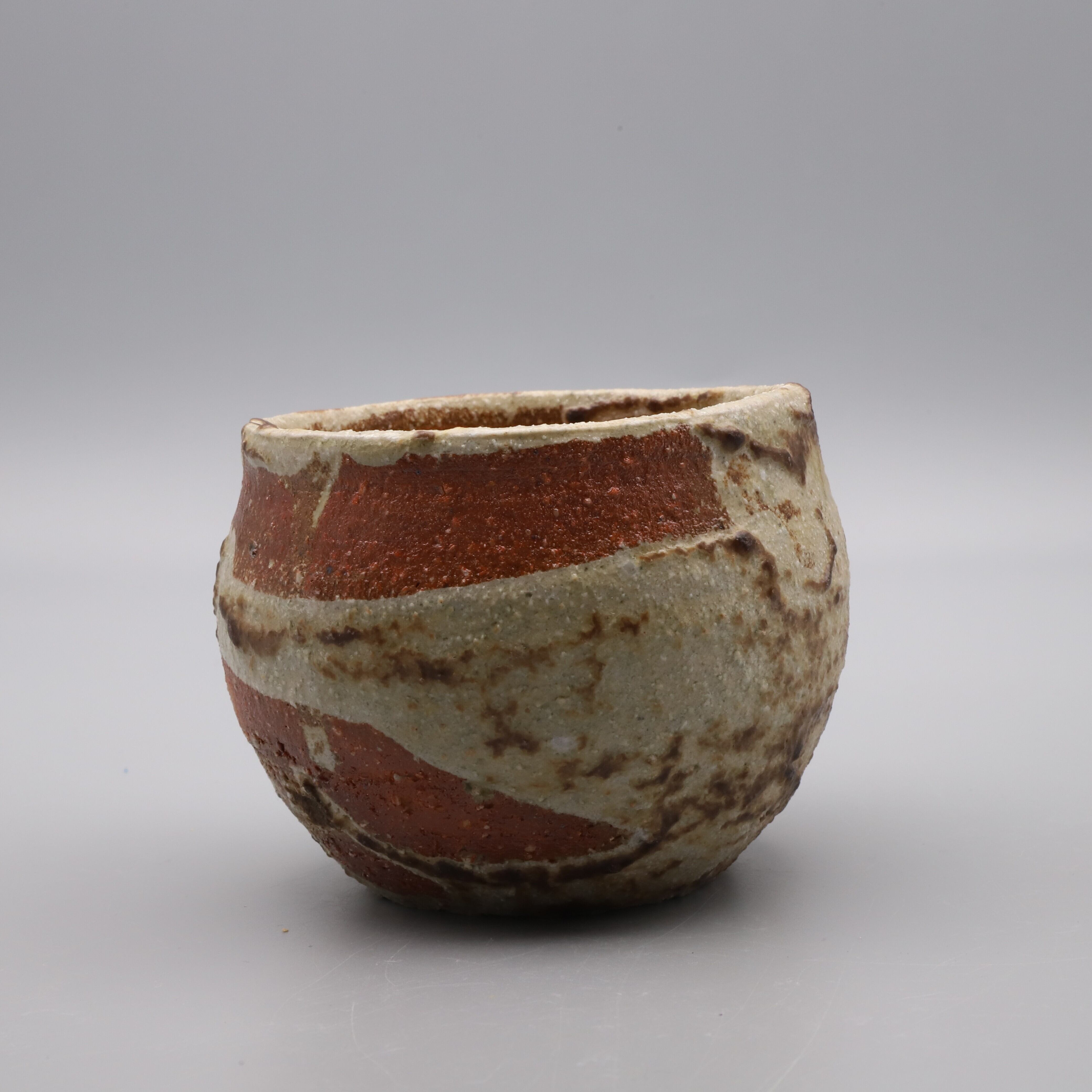 旭 守男作陶、窯変灰釉焼酎杯です。荒土を使った伊賀風の地肌が、自然な風合いの灰釉によって予期しない(面白い)文様に変わり風景を作っています。ウイスキーのロックグラスなど自由な発想でお使いいただけます。窯変灰釉は旭先生のオリジナル作品です。