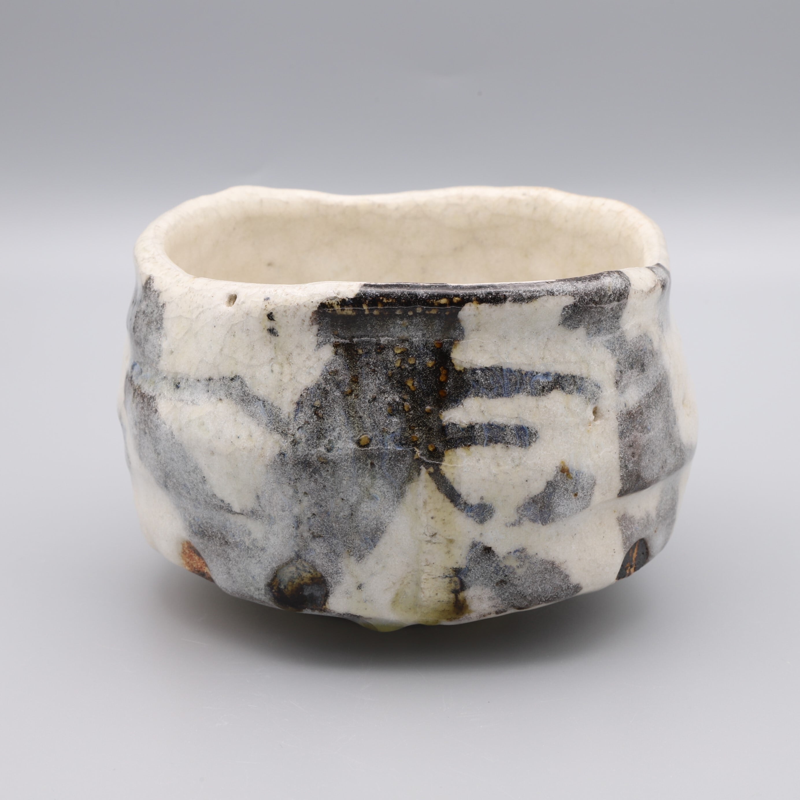 Mitsufuji Tasuku pottery, Shino tea bowl fired in an hole kiln ("anagama"). Iron painting is drawn on the outside. The shape is required to be squeezed vertically and horizontally with spatula, and the spatula trace is tightening the work.