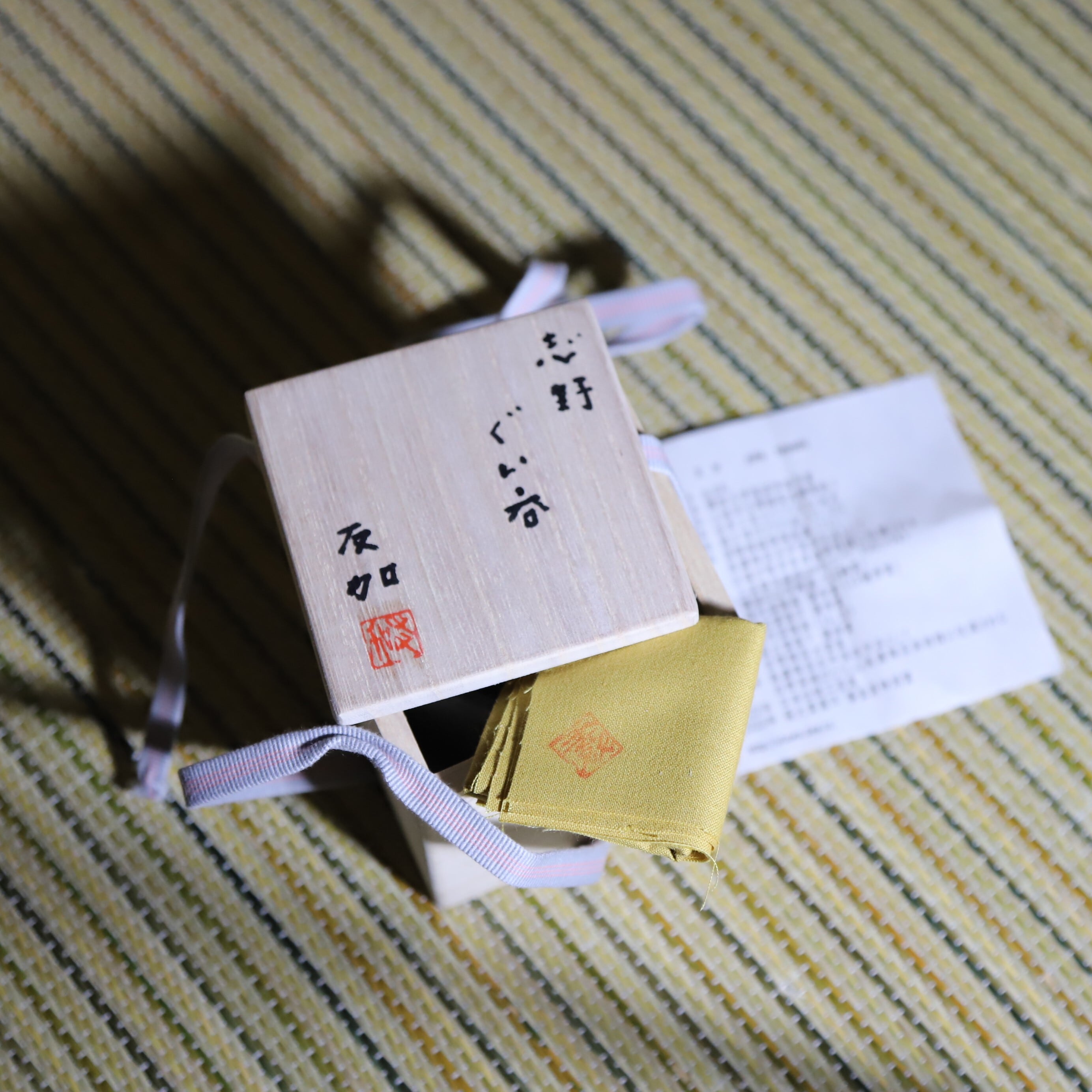 It is a sake cup that fit with the times by incorporating design into traditional Shino. Feminine writing on the box and pink box straps make you feel like Yuka Hayashi.