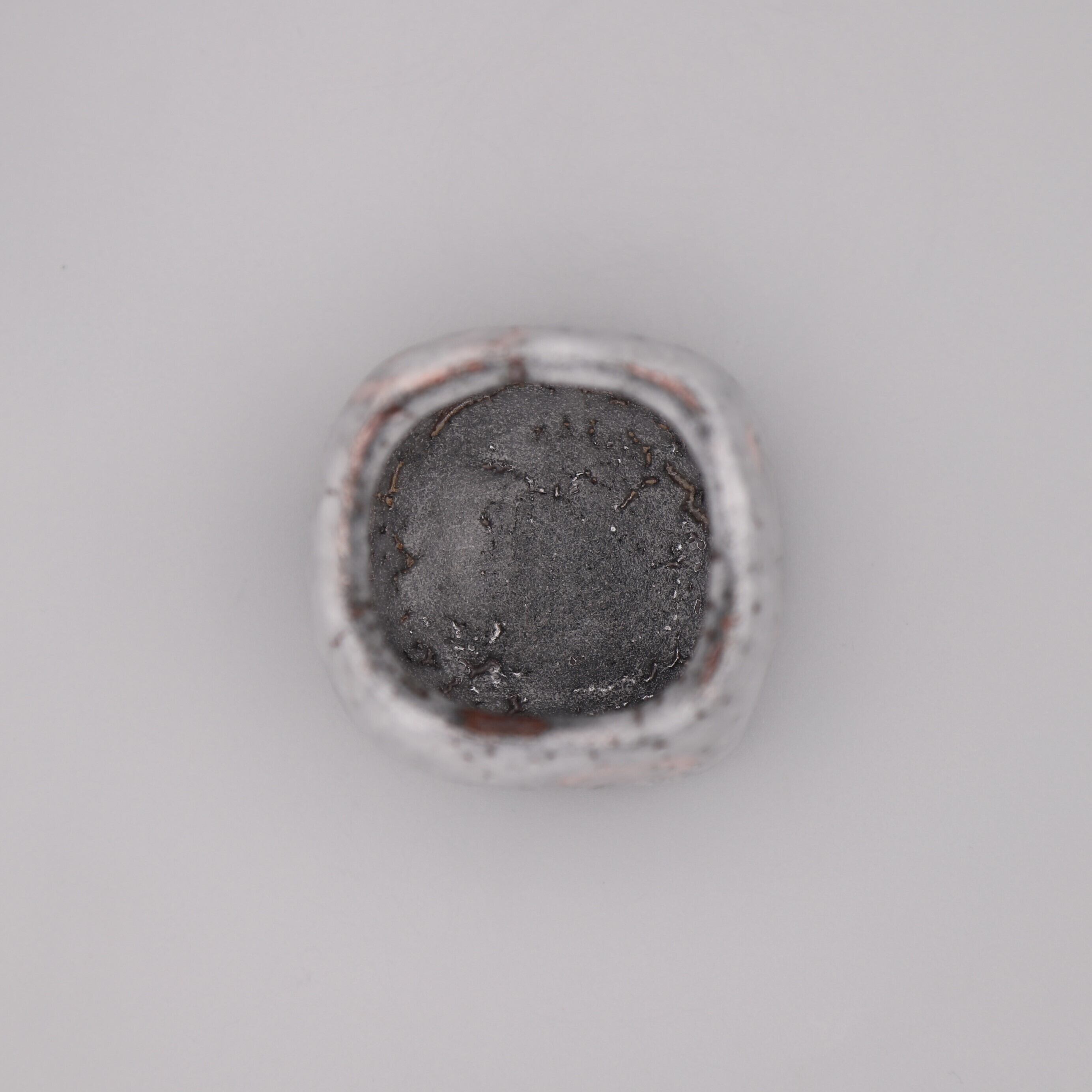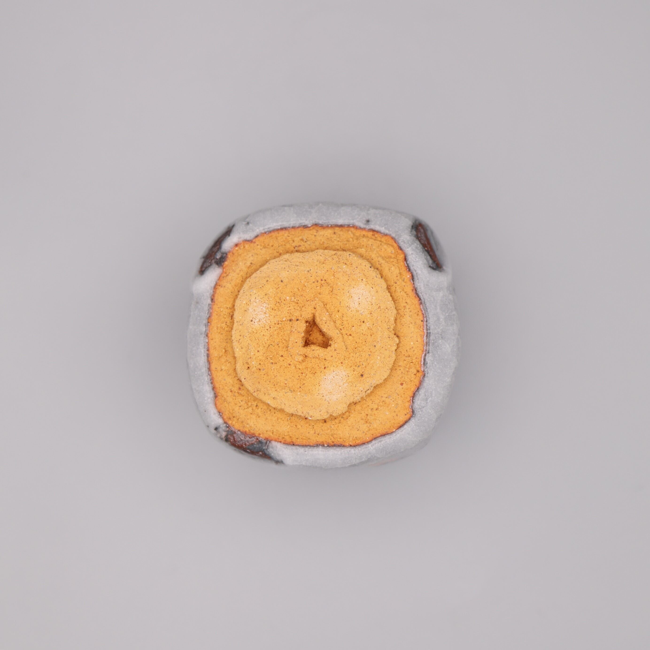 林 友加 作陶、志野ぐい吞ピンク角型です。淡いグレーの地肌の中に月や水紋をイメージしたピンクのアクセントが可愛らしい作品です。