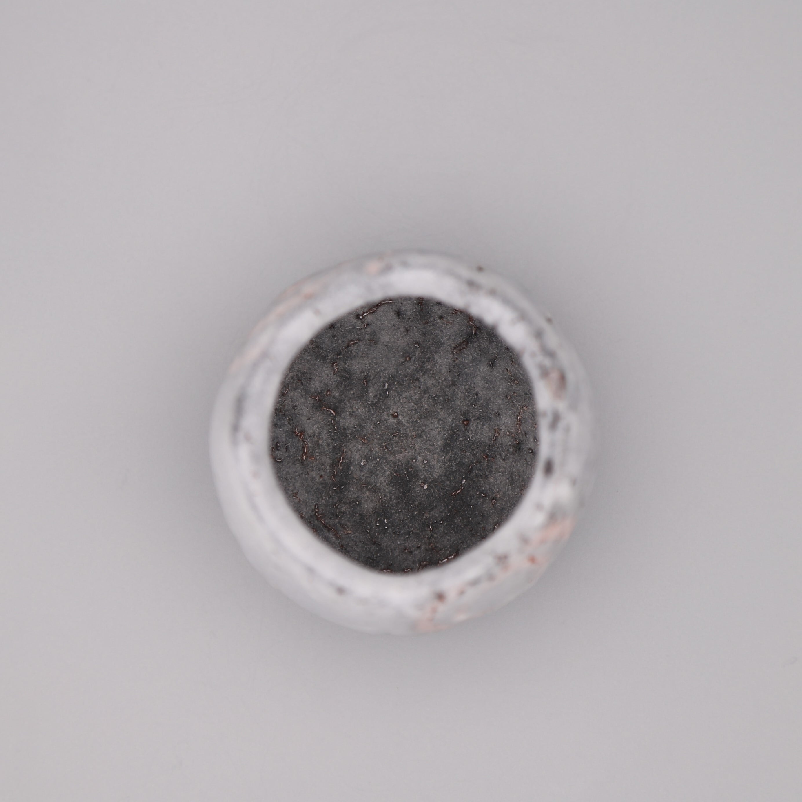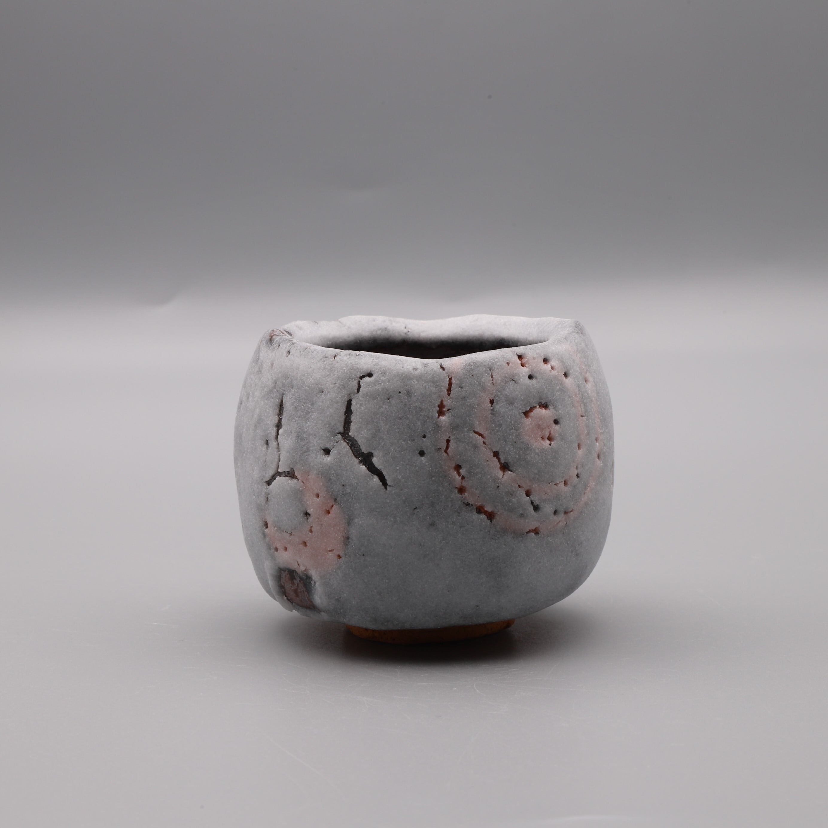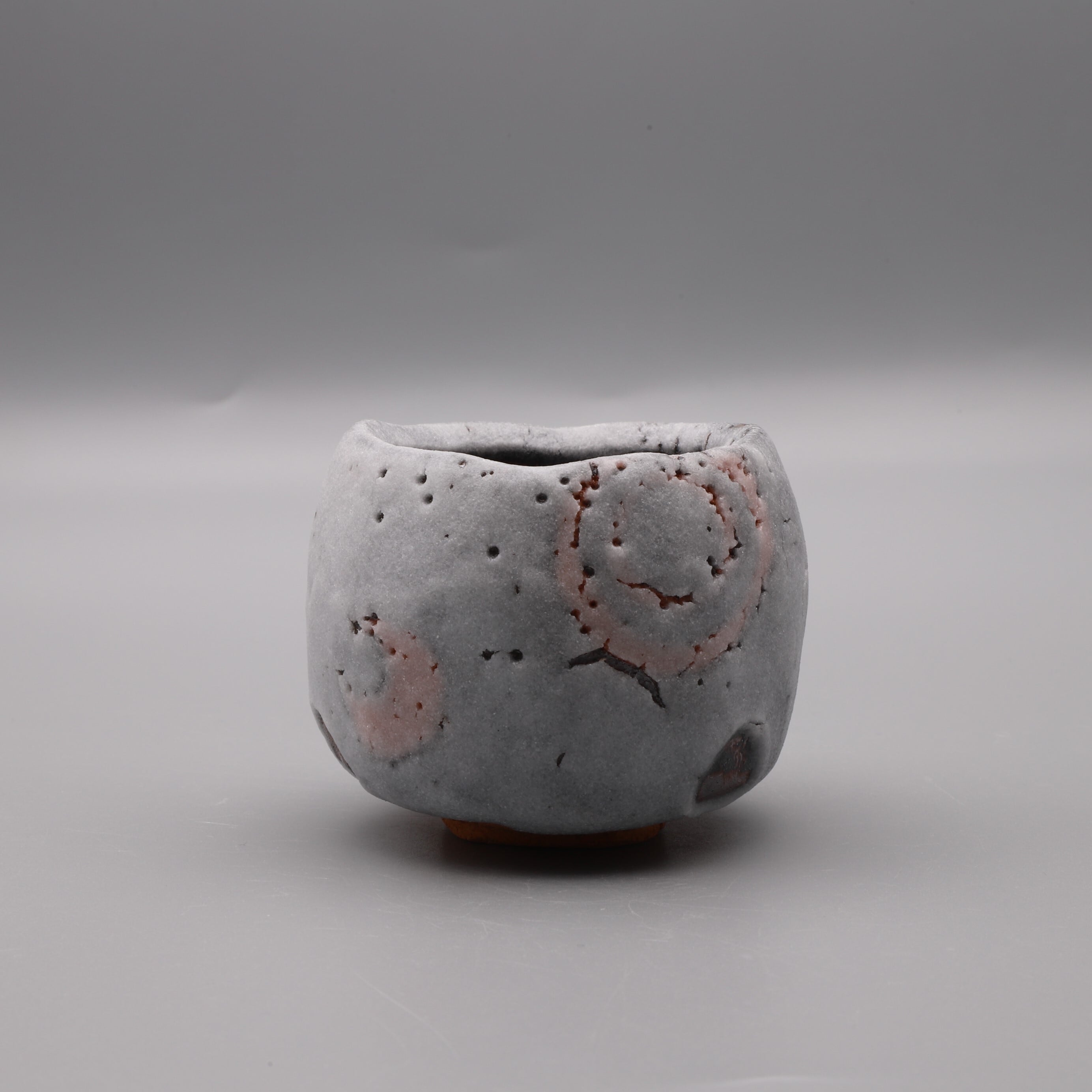 林 友加 作陶、志野ぐい吞ピンク丸型です。淡いグレーの地肌の中に月や水紋をイメージしたピンクのアクセントが可愛らしい作品です。