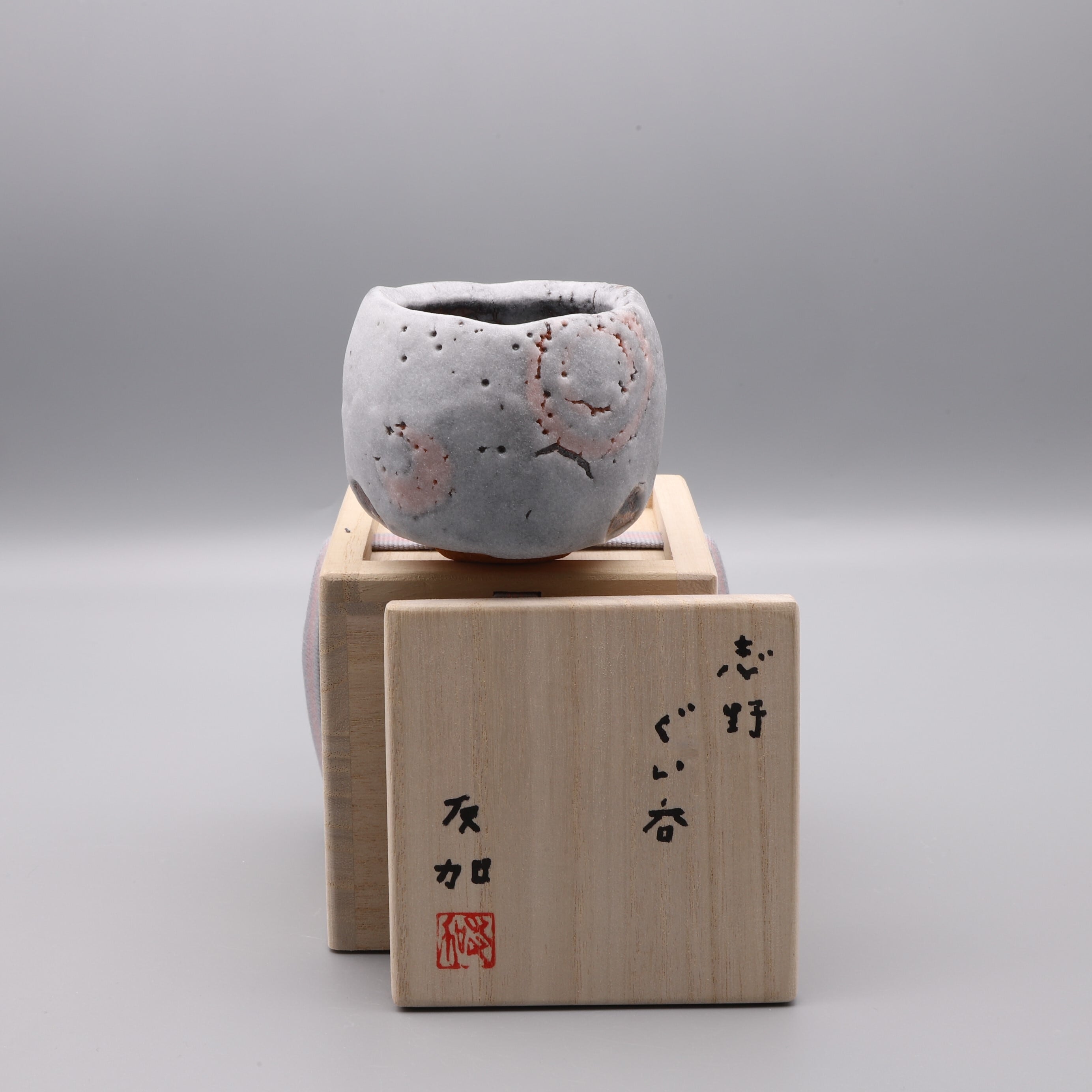伝統的な志野にデザイン性を取り入れ、時代にマッチしたぐい吞みです。女性らしい箱書きやピンクの箱紐が林 友加先生らしさを感じます。